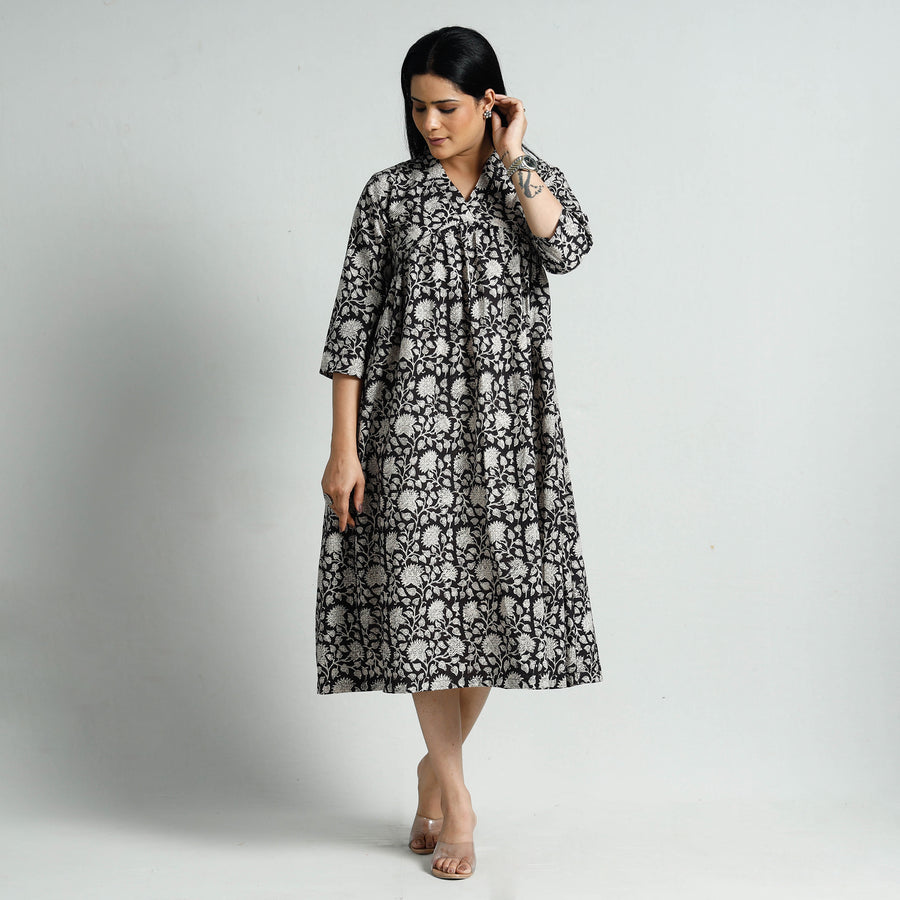 This bagru hand block printed cotton flared dress is a perfect blend of style and comfort. This dress is crafted from naturally dyed cotton fabric through the traditional mud resist process by using hand-carved wooden blocks practised in Bagru, Rajasthan, ensuring a comfortable feel against your skin. This dress features intricate patterns created by hand-carved wooden blocks. This cotton dress makes you comfortable all day long. This dress is perfect for your daily outing and for a special occasion.