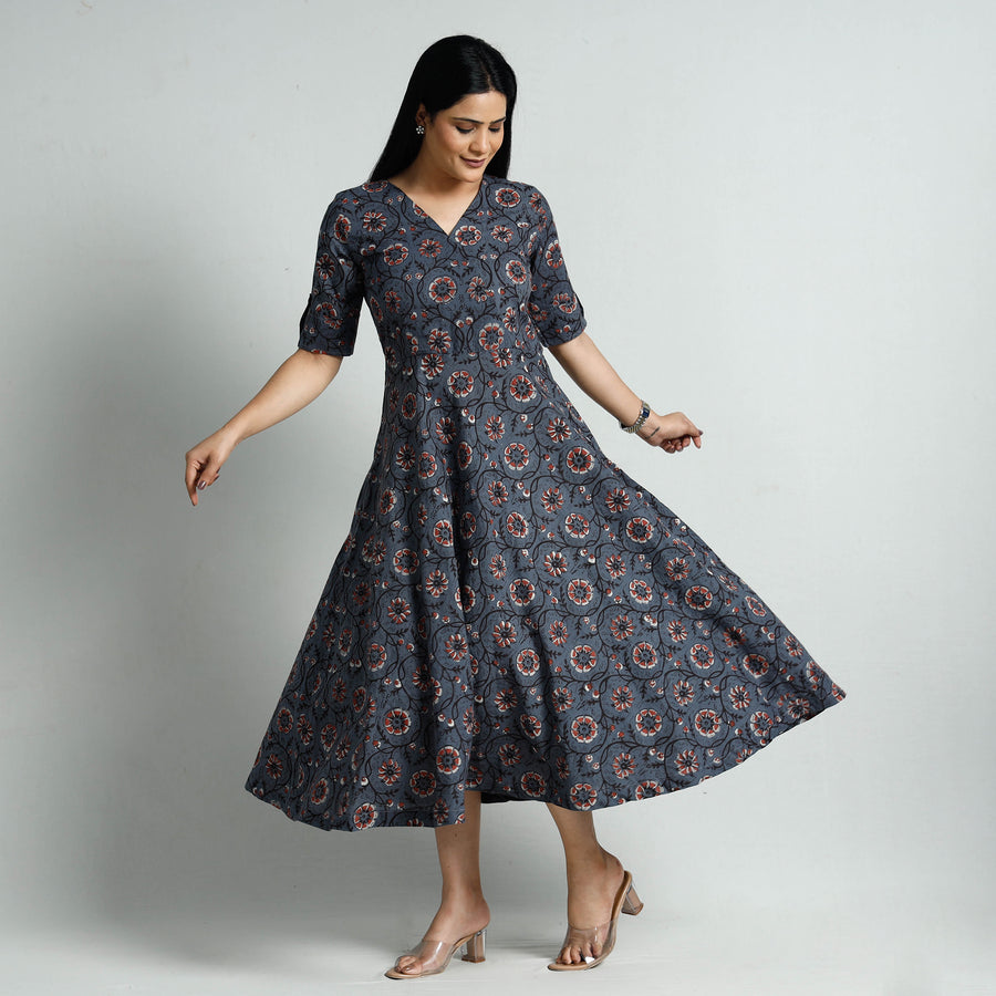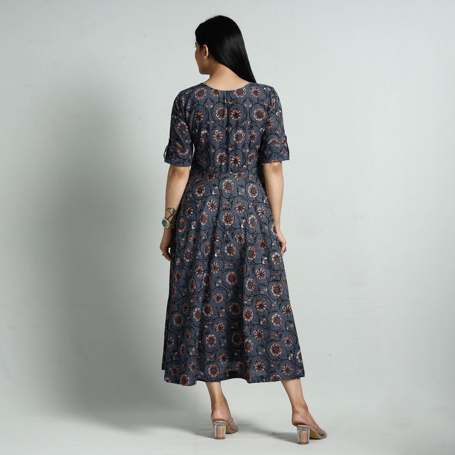 This bagru hand block printed cotton flared dress is a perfect blend of style and comfort. This dress is crafted from naturally dyed cotton fabric through the traditional mud resist process by using hand-carved wooden blocks practised in Bagru, Rajasthan, ensuring a comfortable feel against your skin. This dress features intricate patterns created by hand-carved wooden blocks. This cotton dress makes you comfortable all day long. This dress is perfect for your daily outing and for a special occasion.
