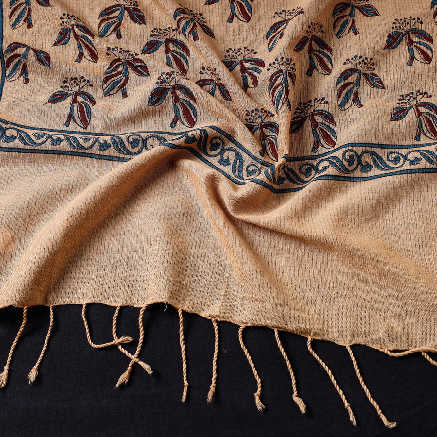 Fine quality beige mangalagiri handloom block printed cotton stole with tassels. Crafted with precision and passion, this stole showcases the exquisite artistry of mangalagiri handloom weaving. The stole features intricate kalamkari block prints, woven from pure soft cotton, it offers a luxurious drape and exceptional comfort. Making it a versatile accessory for both casual and formal occasions made using azo free dye colours from the east godavari and krishna district of andhra pradesh.