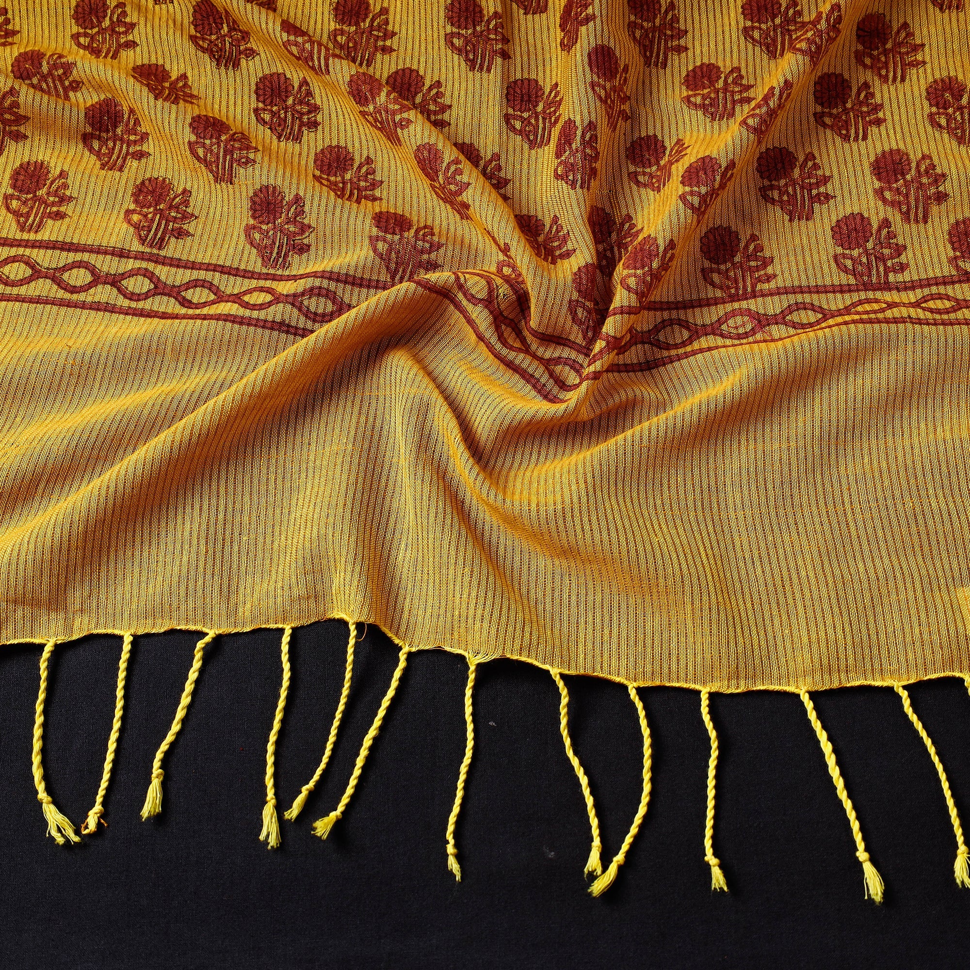 Fine quality mangalagiri handloom block printed cotton stole with tassels. Crafted with precision and passion, this stole showcases the exquisite artistry of mangalagiri handloom weaving. The stole features intricate kalamkari block prints, woven from pure soft cotton, it offers a luxurious drape and exceptional comfort. Making it a versatile accessory for both casual and formal occasions made using azo free dye colours from the east godavari and krishna district of andhra pradesh.