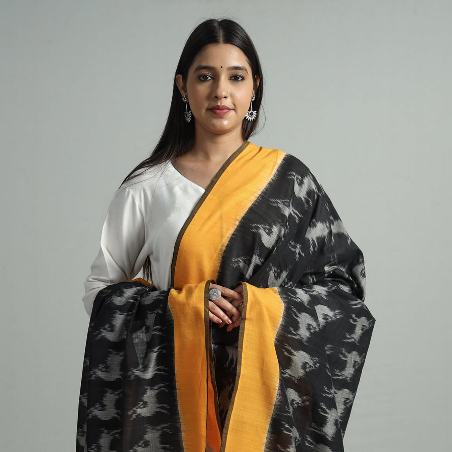 This pochampally ikat cotton dupatta is crafted with the finest quality cotton fabric and features intricate ikat patterns created using a resist dyeing technique. The fabric is dyed using VAT dyes that do not bleed or fade easily. The dupatta comes with tassels that add to its elegance and can be paired with a range of casual outfits for a stylish look.