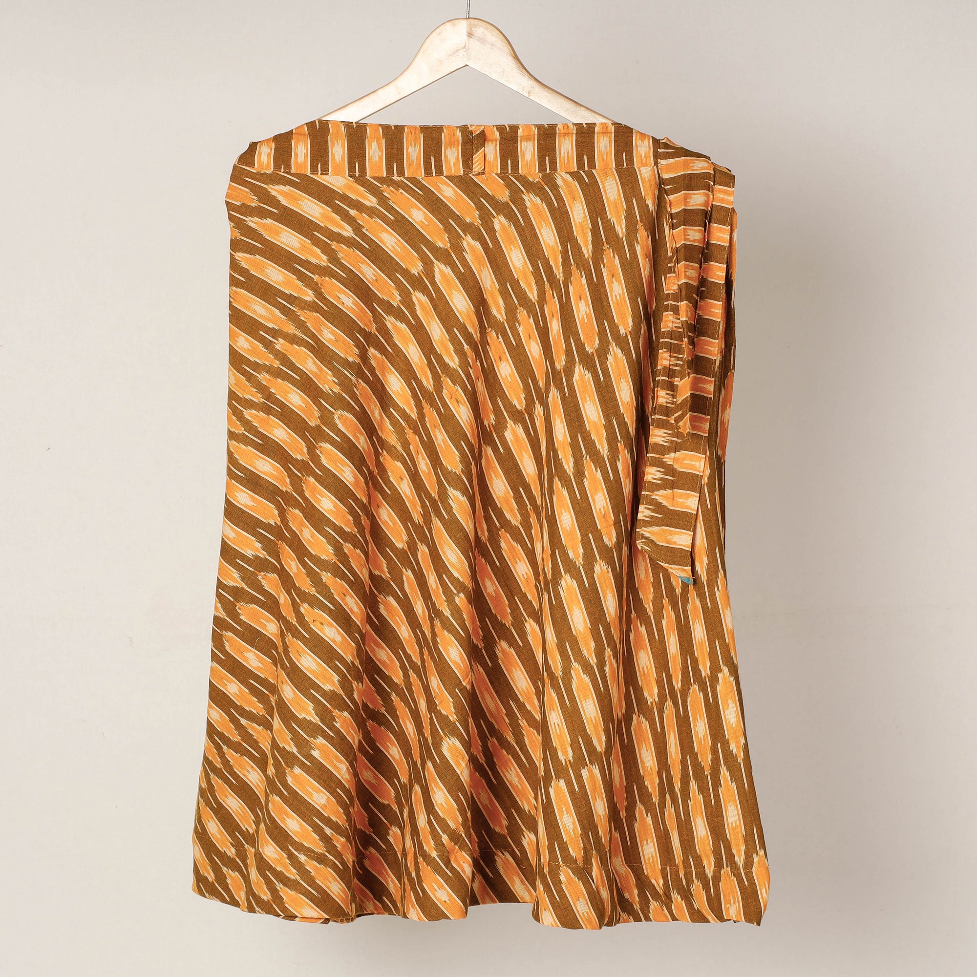 Elevate your style with this fine-quality brown pochampally ikat weave pure cotton wrap around skirt. Featuring a waist tie-up closure, this skirt is not only stylish but also comfortable to wear. The ikat (ikkat) dyeing technique used in this skirt creates beautiful patterns and designs, making it a standout piece in your wardrobe. Step out in style with this exquisite pochampally ikat wrap around skirt that showcases the beauty of traditional Indian textiles and craftsmanship.