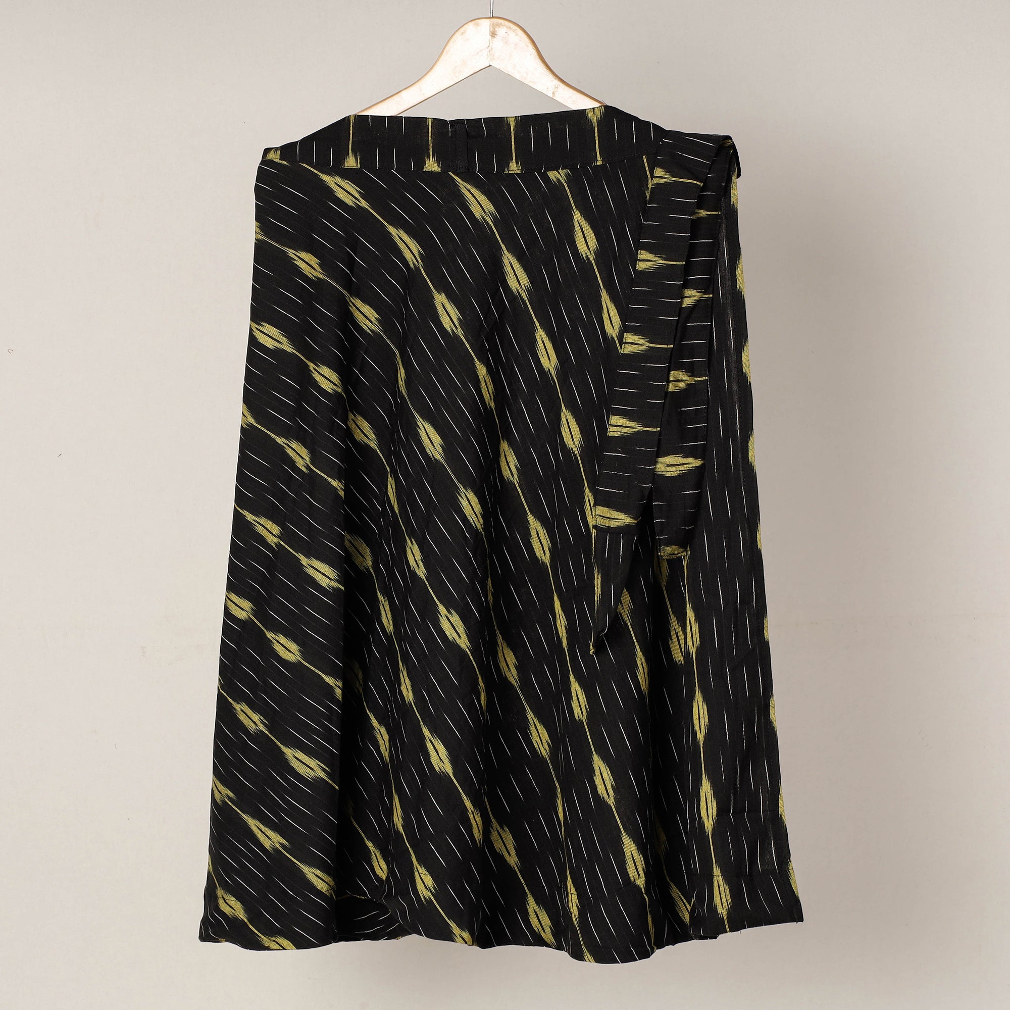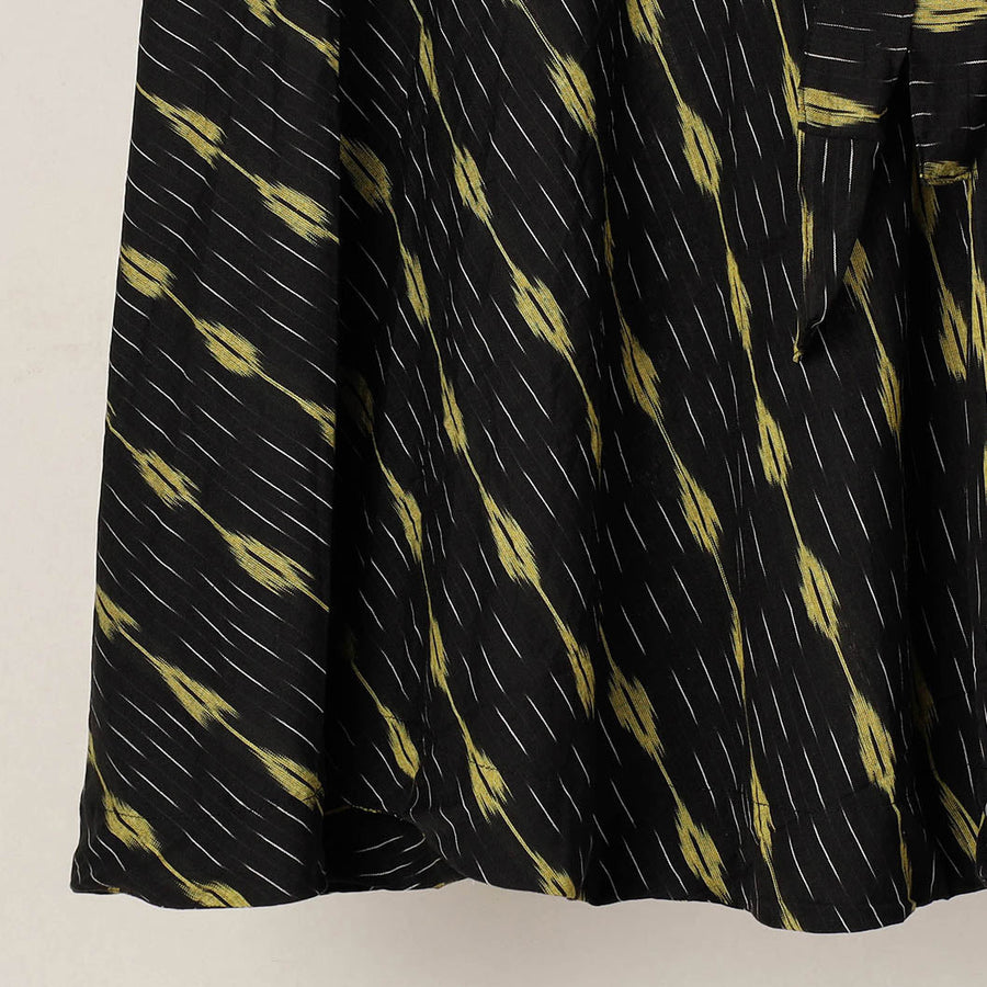 Elevate your style with this fine-quality black pochampally ikat weave pure cotton wrap around skirt. Featuring a waist tie-up closure, this skirt is not only stylish but also comfortable to wear. The ikat (ikkat) dyeing technique used in this skirt creates beautiful patterns and designs, making it a standout piece in your wardrobe. Step out in style with this exquisite pochampally ikat wrap around skirt that showcases the beauty of traditional Indian textiles and craftsmanship.