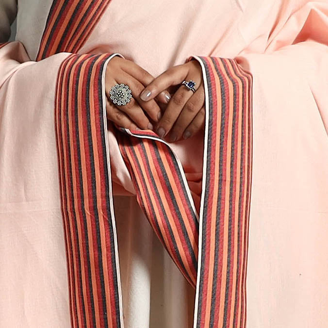 Fine quality peach kutch bhujodi weaving handloom fine cotton dupatta with tassels by Vinay Siju. This dupatta is crafted using cotton fibers. The kutch bhujodi weaving technique is employed to create this exquisite dupatta. Skilled artisans from the village of Bhujodi in Kutch meticulously handloom this textile using traditional weaving methods. The intricate weaving process results in a stunning pattern that showcases the artistry and expertise of the weavers.