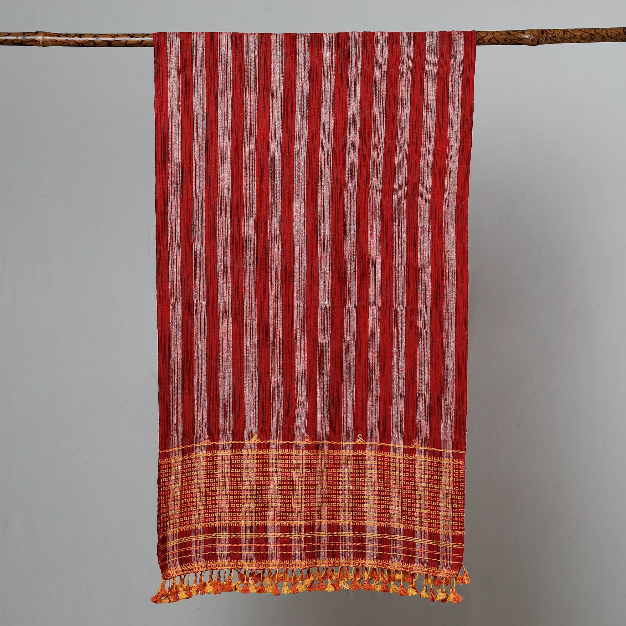 Fine quality kutch bhujodi hand weaving organic kala cotton stole with tassels.This stole is made with 100% certified organic cotton with azo free dye colours. Kala cotton is the original pure old world organic cotton of India and it is one of the few genetically pure cotton species remaining in India. Softer feel, breathes easy.