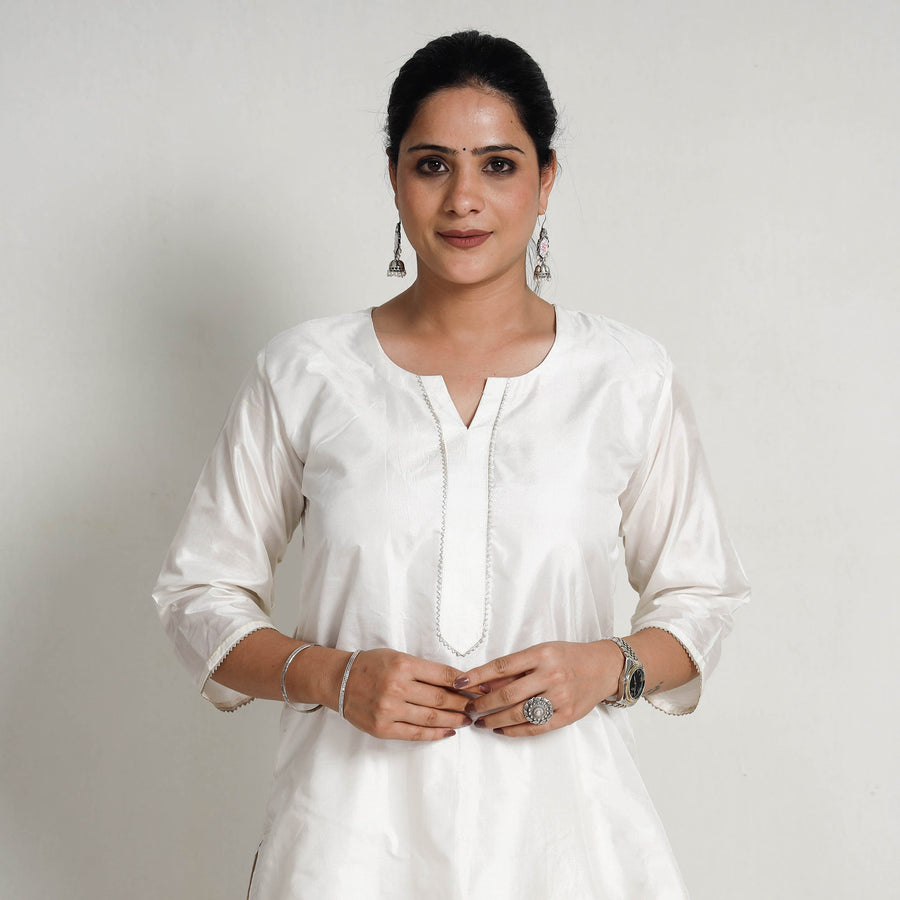 This plain pure silk long kurta is a perfect blend of style and comfort. This kurta is crafted from plain pure silk fabric, ensuring a comfortable feel against your skin. The kurta also features a convenient one-side pocket, perfect for carrying small essentials. This silk kurta makes you comfortable all day long. Upgrade your wardrobe with this plain pure silk kurta.