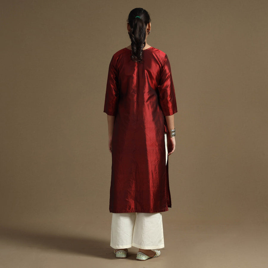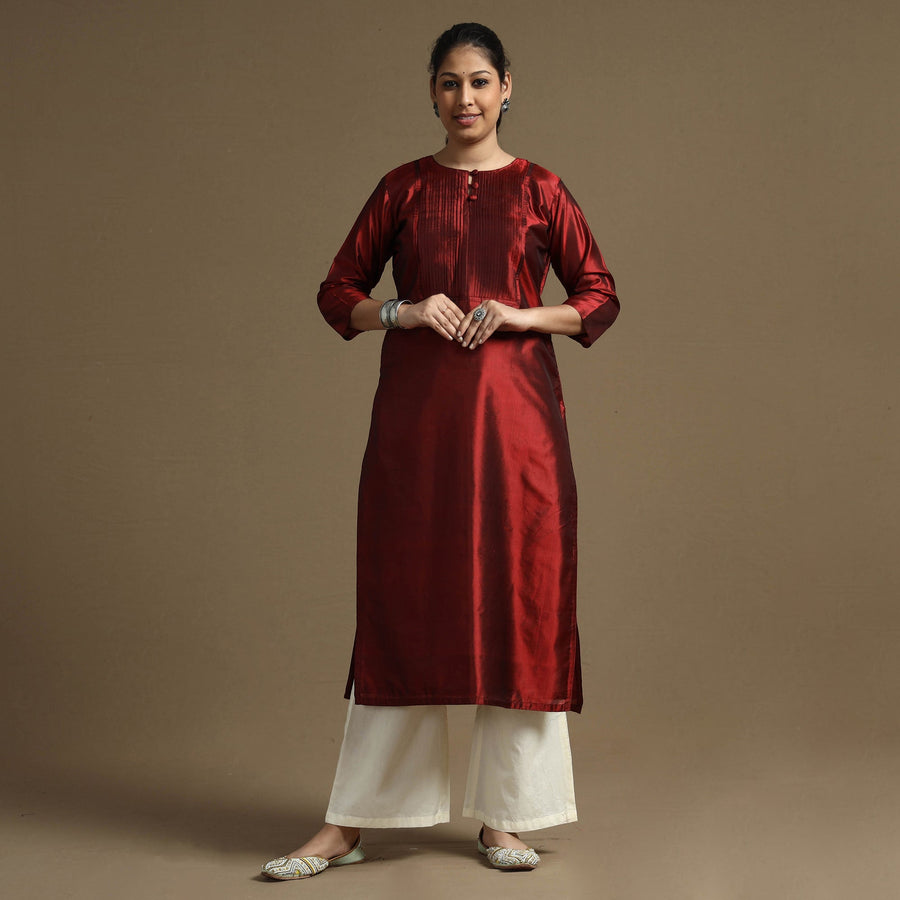 Ethnic Maroon - Plain Pintuck Pure Silk Kurta