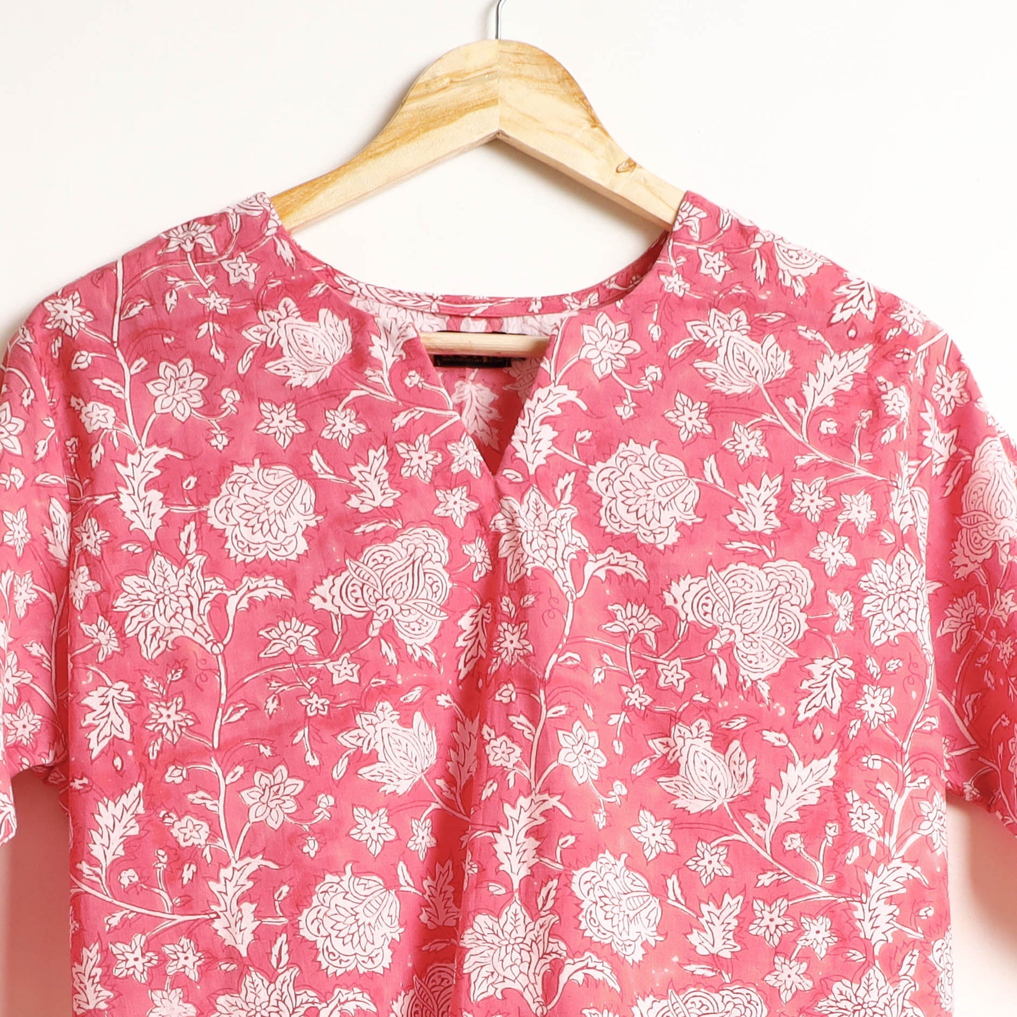 This sanganeri hand block printed cotton night suit set is crafted from cotton fabric. The cotton fabric ensures a comfortable night's sleep. The pyjama features an elasticated waist and two side pockets for added convenience. The night suit will give you the freedom to customsize the fit to suit your unique shape. This night suit is beautiful and skin-friendly, and it allows you to move and sleep with ease and comfort.