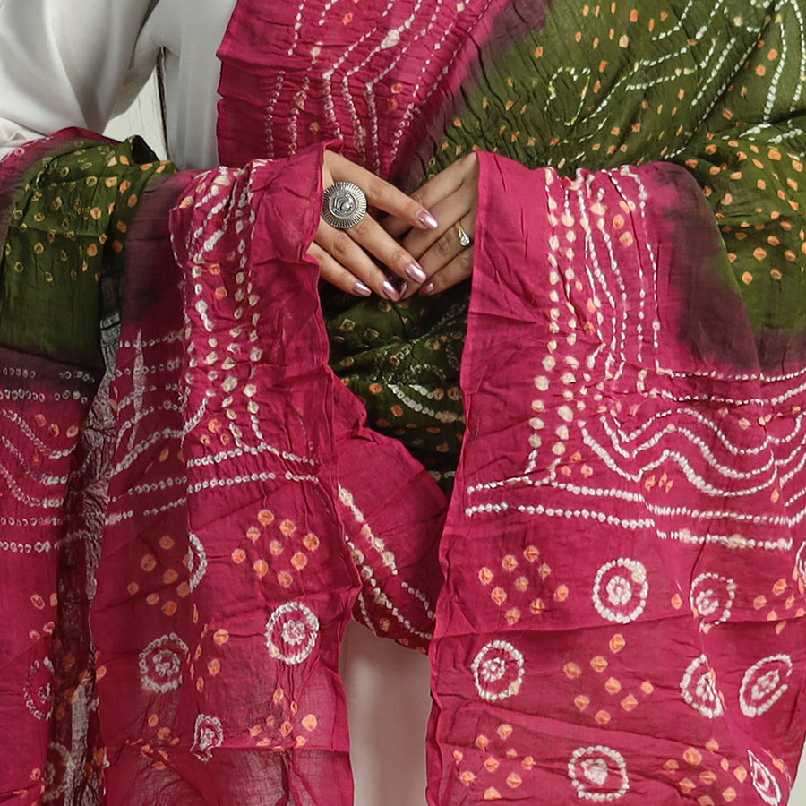 This fine quality pink bandhani tie-dye cotton dupatta is skillfully crafted by the artisans of kutch using the traditional bandhani tie-dye technique. The dupatta features a majestic bandhani pattern, created by tying the fabric with thread at several points before dyeing it. The result is a beautiful, intricate pattern that is unique to each piece. The cotton fabric is lightweight and breathable, making it a perfect addition to any wardrobe for any occasion.