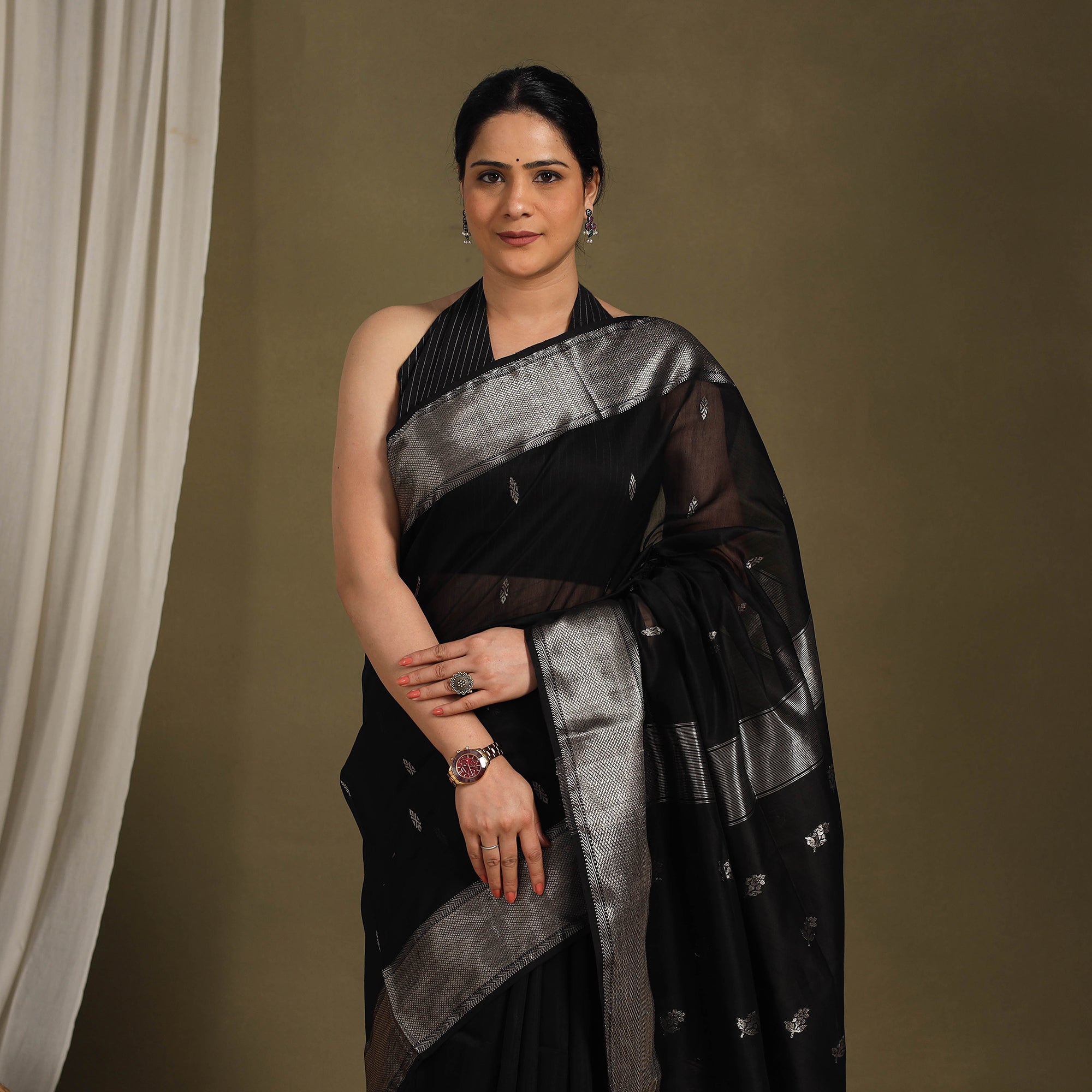 This exquisite black maheshwari silk cotton handloom zari buta saree with woven zari border is skillfully handwoven in Maheshwar, a heritage town in India, using traditional techniques. The weaving traditional handloom weaving techniques passed down through generations of skilled artisans in Maheshwar. This lightweight, sheer saree is perfect for special occasions, adding a touch of grace and sophistication to your attire. Elevate your style with this exquisite piece of artistry.