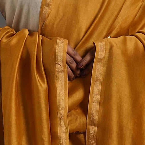 Fine golden orange kashida thread work hand embroidery handloom chanderi silk dupatta by Zahoor Ahmed from Harwan, Kashmir.
