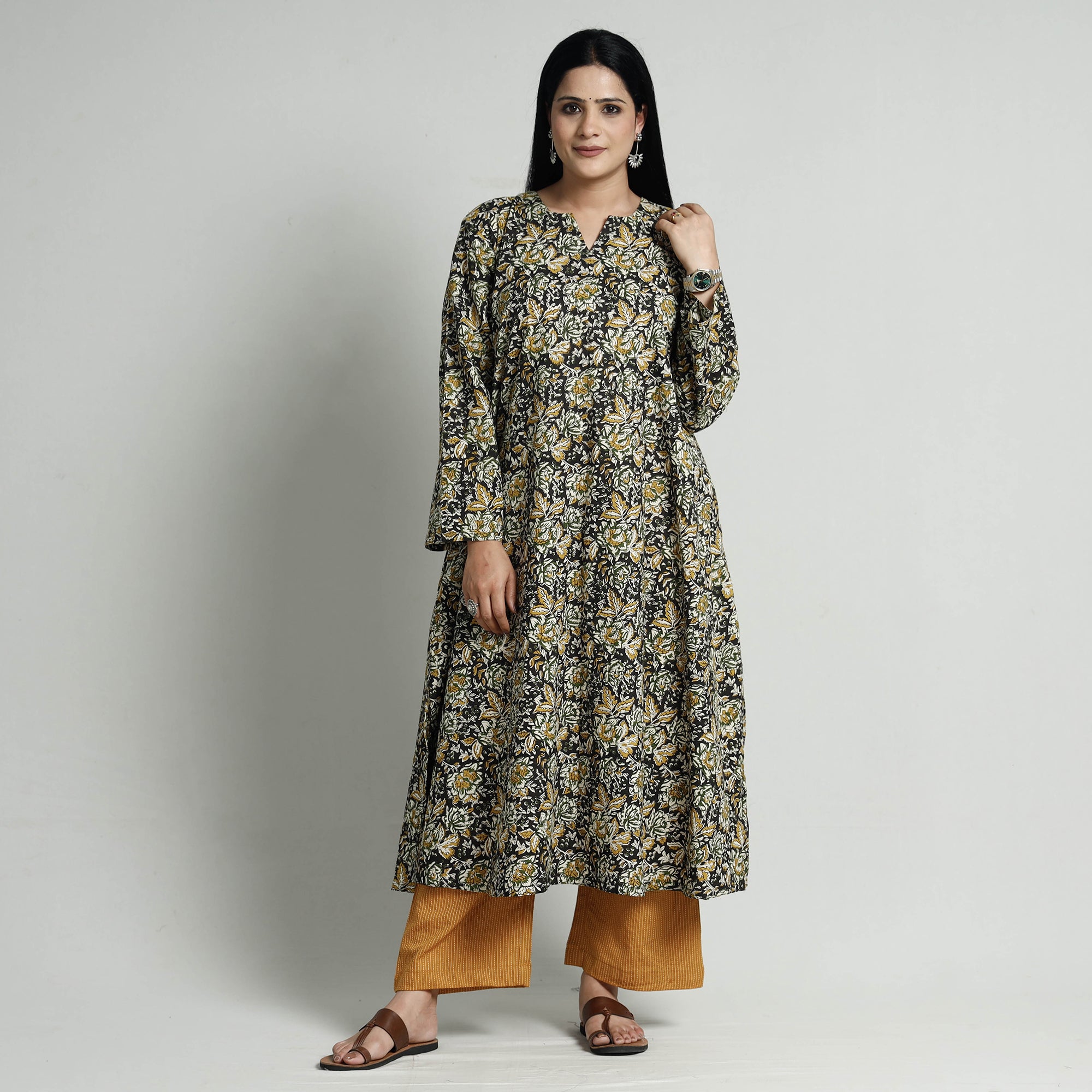 Look and feel beautiful in this uniquely designed bagru hand block printed cotton long Kurta with palazzo set. This suit set includes a natural-dyed cotton Kurta and plain cotton palazzo. The Kurta also features a convenient one-side pocket, perfect for carrying small essentials, and the palazzo features an elasticized waist and two side pockets, adding functionality to this palazzo. Perfect for special occasions and celebrations, this elegant suit exudes traditional charm with its hand-block printed motifs.