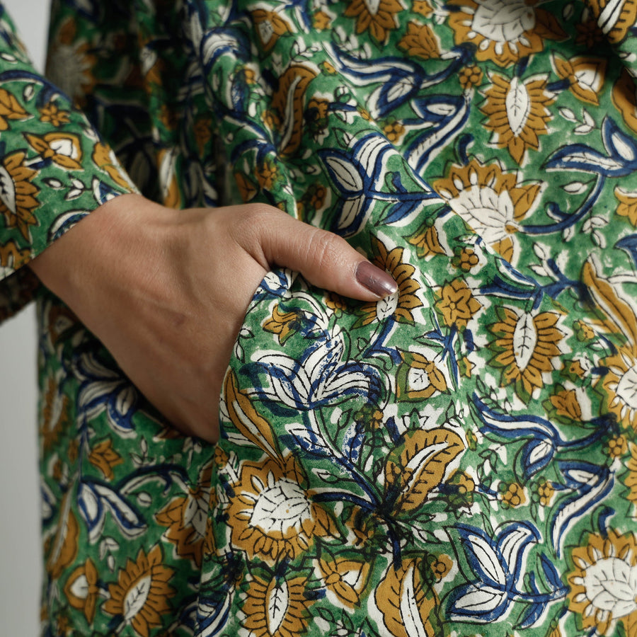 | Material | Look and feel beautiful in this uniquely designed bagru hand block printed cotton long Kurta with palazzo set. This suit set includes a natural-dyed cotton Kurta and plain cotton palazzo. The Kurta also features a convenient one-side pocket, perfect for carrying small essentials, and the palazzo features an elasticized waist and two side pockets, adding functionality to this palazzo. Perfect for special occasions and celebrations, this elegant suit exudes traditional charm with its hand-block printed motifs. |