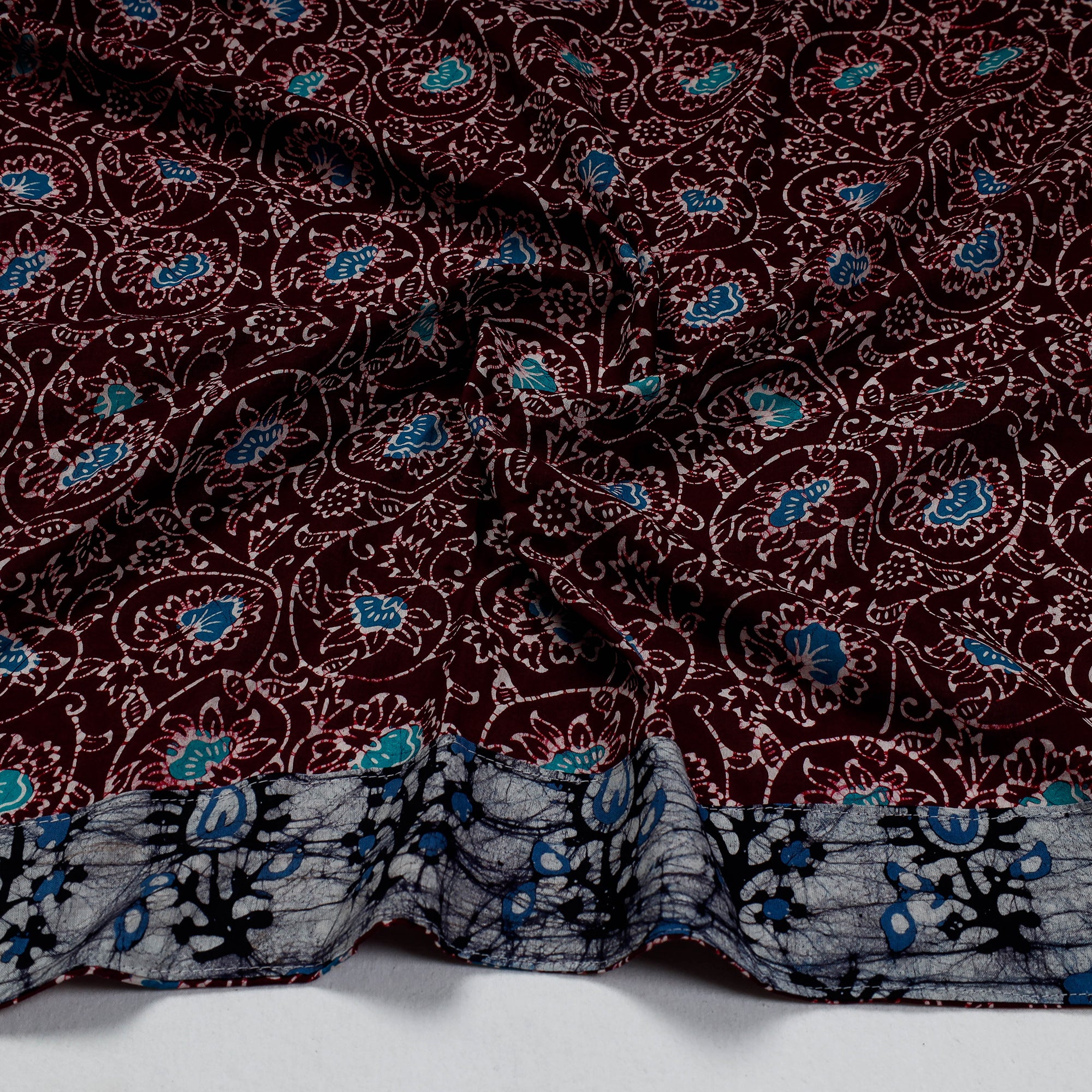 Batik is a very famous technique of wax-resist dyeing applied to whole cloth. The traditional designs and motifs in Indian batik are exceptional. It is a type of resist printing process wherein wax is applied to the fabric in specific areas.