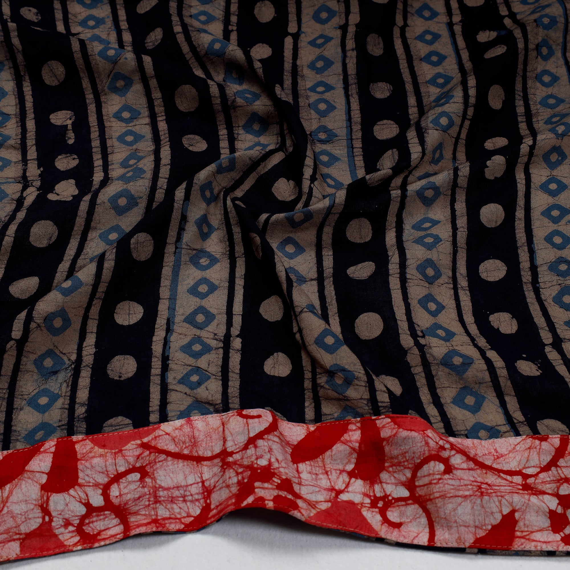 Batik is a very famous technique of wax-resist dyeing applied to whole cloth. The traditional designs and motifs in Indian batik are exceptional. It is a type of resist printing process wherein wax is applied to the fabric in specific areas.