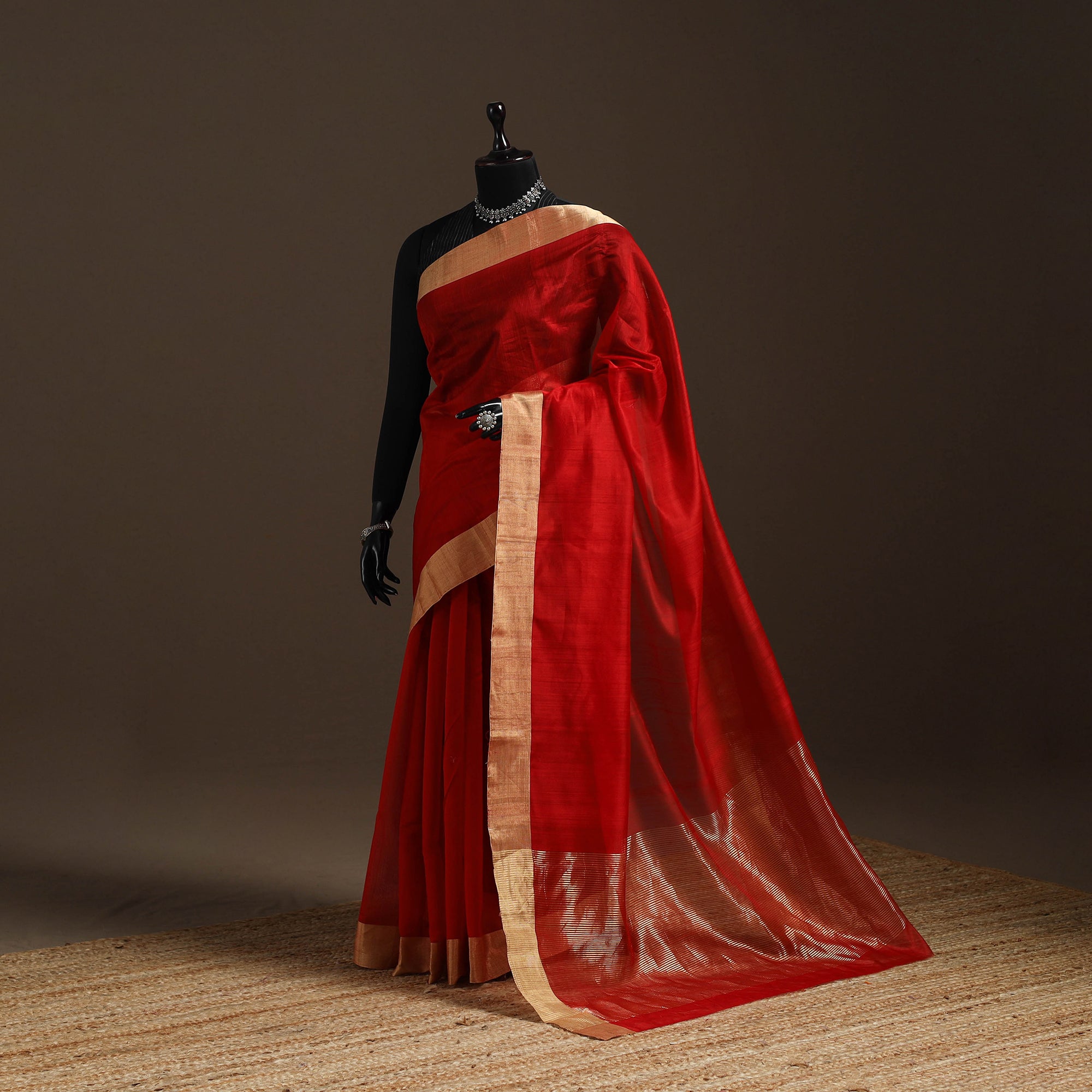 Fine quality red chanderi silk-cotton pure handloom zari border saree meticulously handwoven by the master artisan Rauph Khan. Chanderi weaving is practiced in the historic town of Chanderi in Madhya Pradesh. The buttis or motifs on chanderi blend are primarily hand woven on handloom, with the use of needles. Separate needles are used to create different motifs. Chanderi silks are known for its gossamer looks and amazing feel. This saree is perfect for special occasions or elegant gatherings.