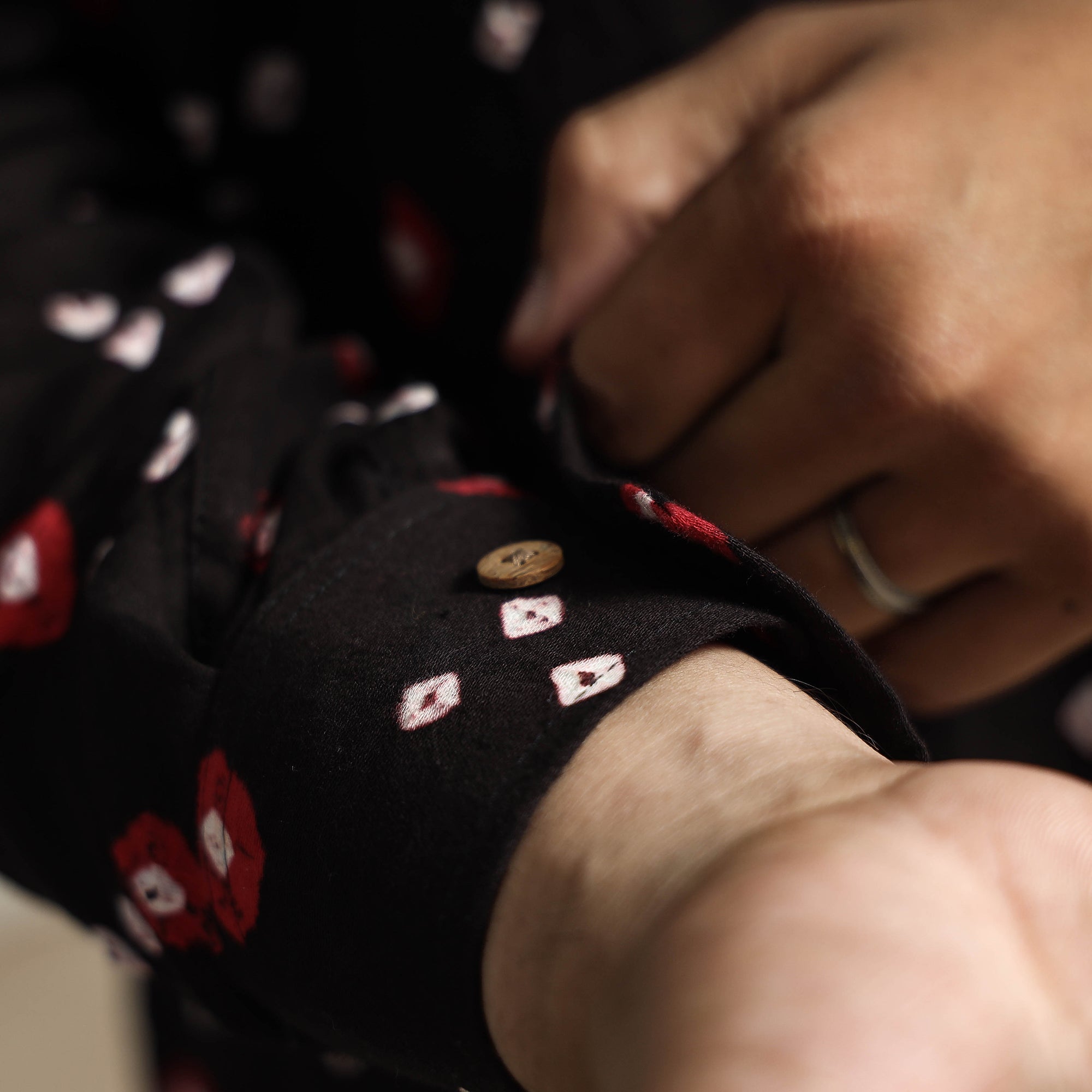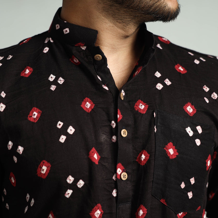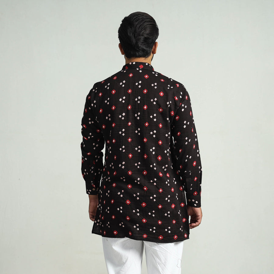 Look and feel beautiful in this uniquely designed bandhani tie-dye cotton men's long kurta with two side pockets that makes you comfortable with ease all day long. It's made from bandhani tie-dye soft cotton fabric featuring the majestic bandhani pattern, tie-dyed using the traditional technique practised by skilled artisans and their families in Kutch. This kurta features full sleeves, stand collar and a button placket which makes it perfect for your daily outings as well as for any special occasion.
