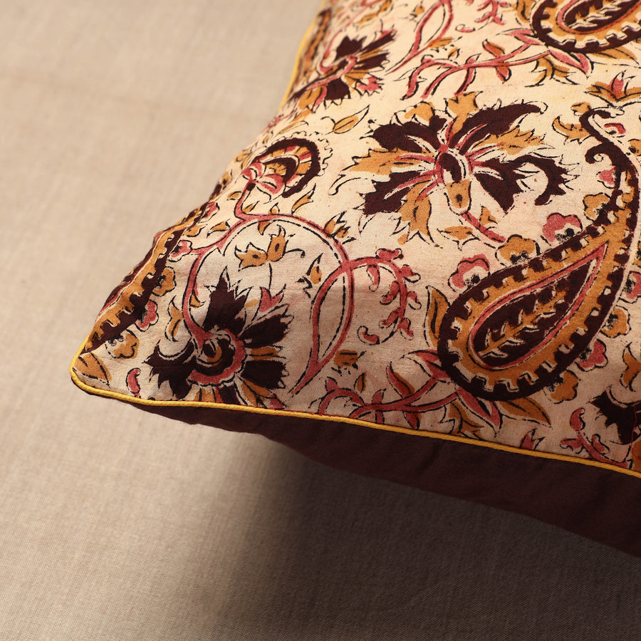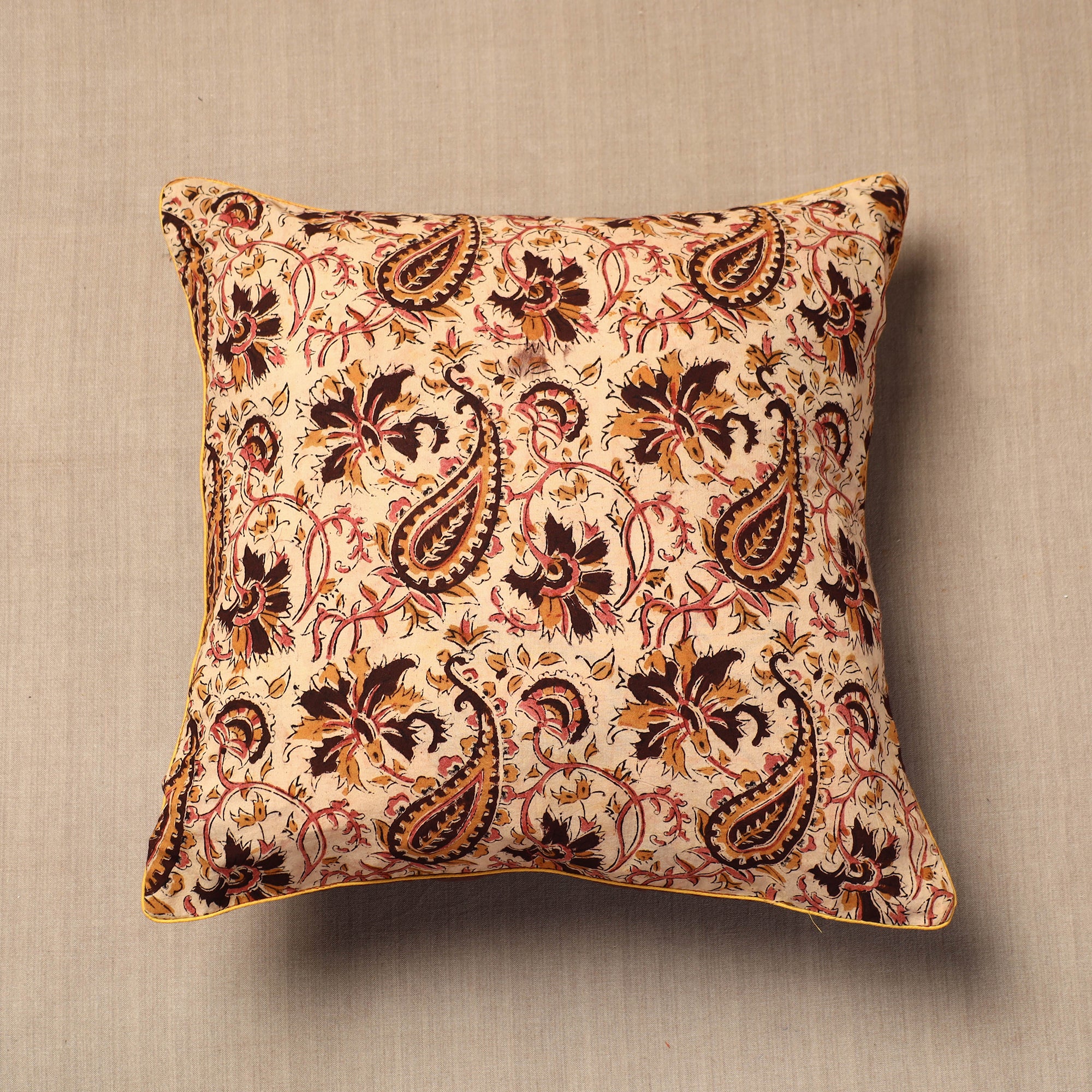 Fine quality beige kalamakari hand block printed cottoncushion cover. Showcasing an assortment of hand block printed motifs inspired by traditional kalamkari painting. Kalamkari is the earliest and more complex techniques of block-printing.