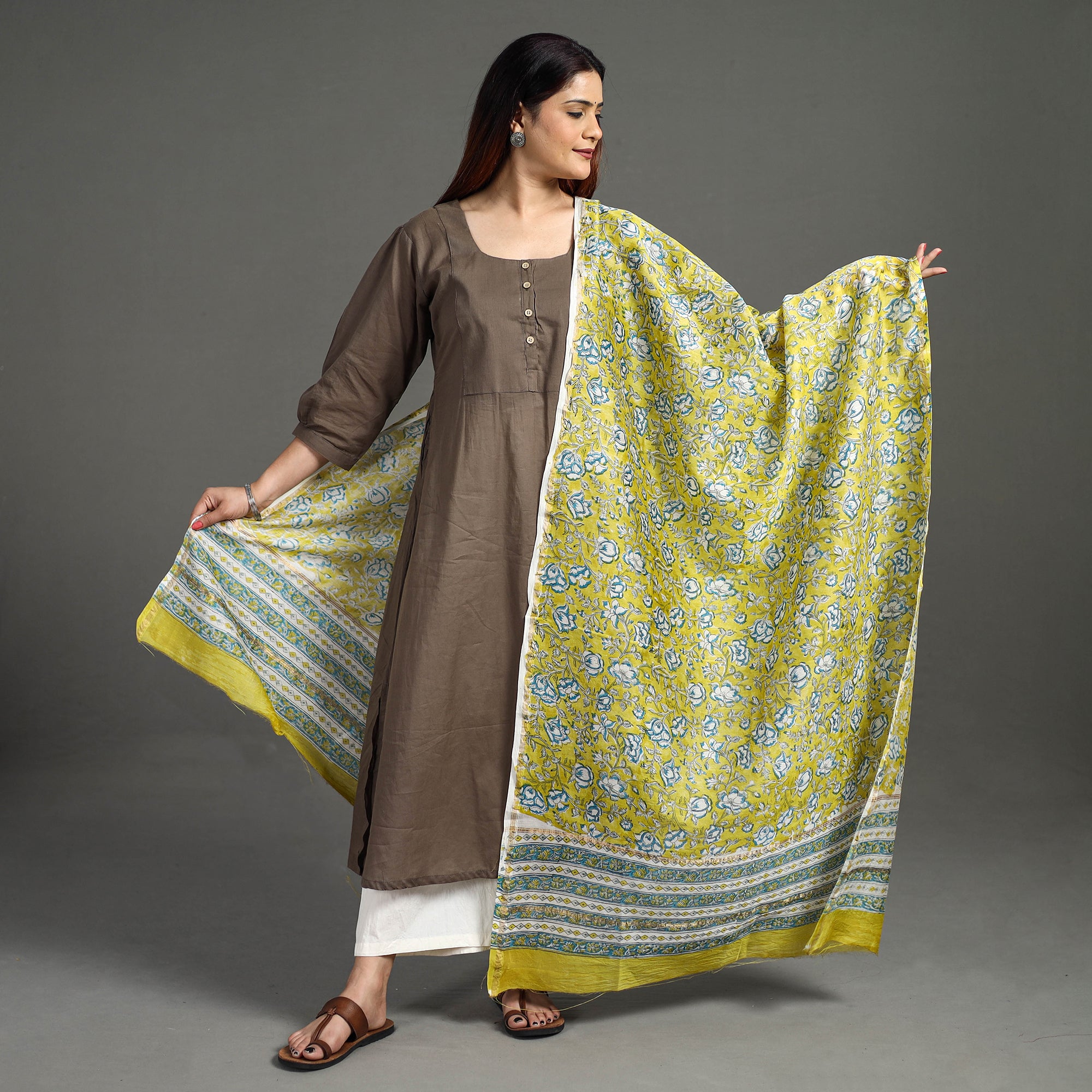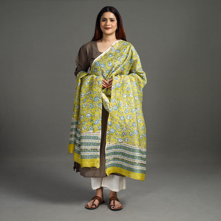Fine quality sanganeri hand block printed chanderi silk dupatta with zari border. made using bleed-free VAT dyes. Sanganeri is a hand-block printing technique originating from Sanganer, a village in the southern part of Jaipur, Rajasthan. Chanderi silks are known for its gossamer looks and amazing feel. Chanderi weaving is practiced in the historic town of Chanderi in Madhya Pradesh.