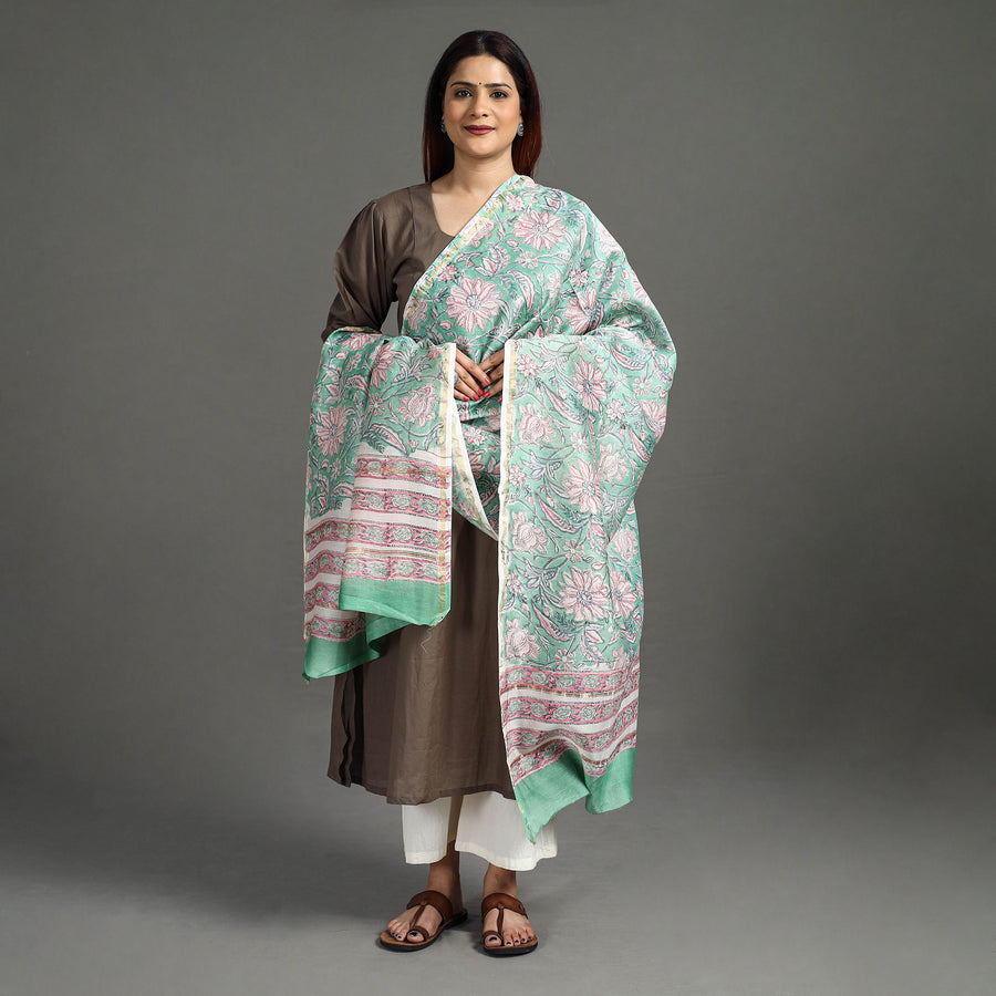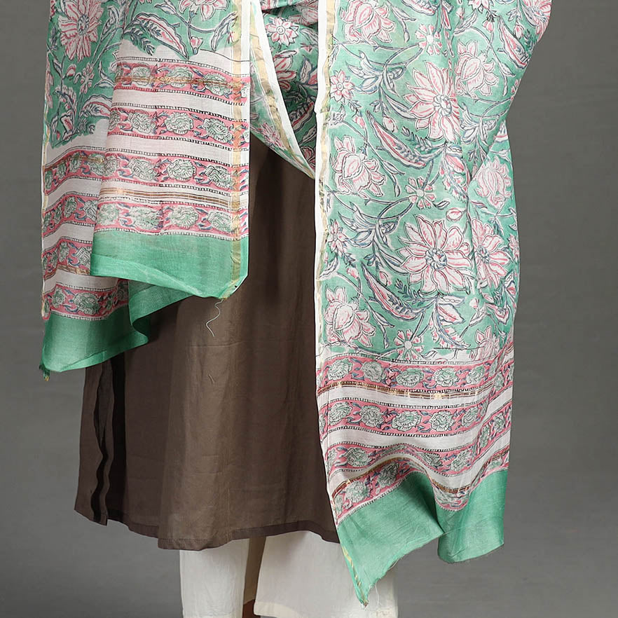 Fine quality sanganeri hand block printed chanderi silk dupatta with zari border. made using bleed-free VAT dyes. Sanganeri is a hand-block printing technique originating from Sanganer, a village in the southern part of Jaipur, Rajasthan. Chanderi silks are known for its gossamer looks and amazing feel. Chanderi weaving is practiced in the historic town of Chanderi in Madhya Pradesh.