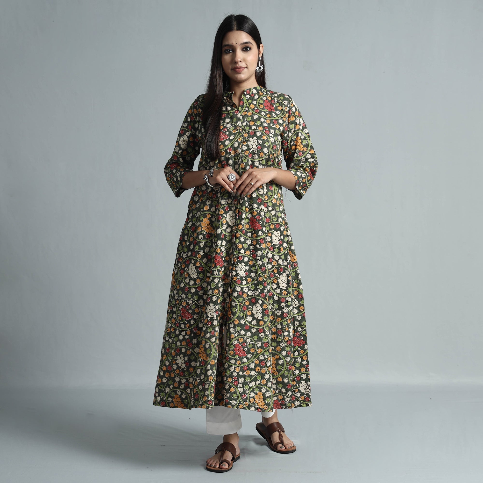 Look and feel beautiful in this uniquely designed cotton printed long kalamkari kurta with a side pocket. Kalamkari is the earliest and most complex technique of printing. This kurta is perfect for your daily outing and for a special occasion.