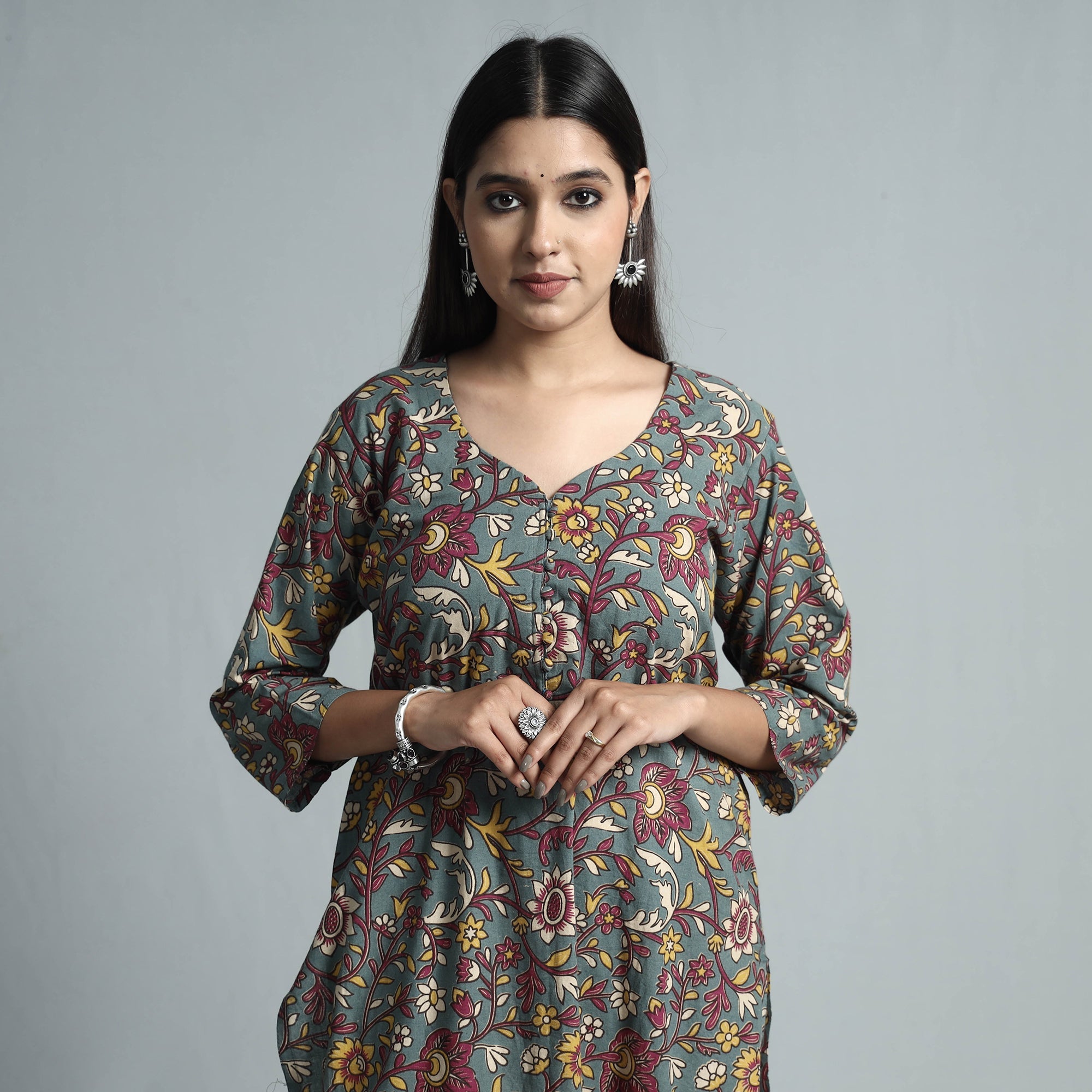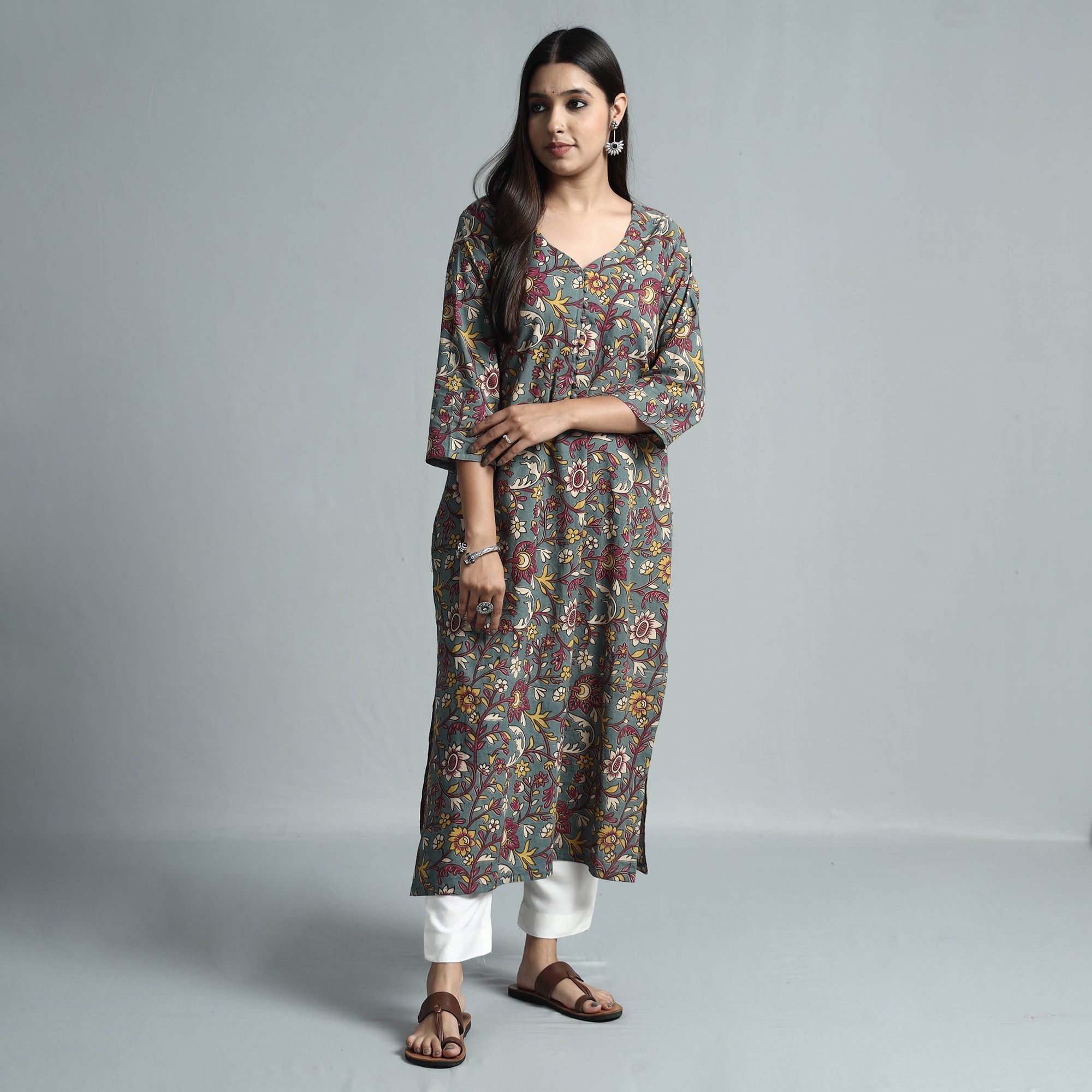 Look and feel beautiful in this uniquely designed cotton printed long kalamkari kurta with a side pocket. Kalamkari is the earliest and most complex technique of printing. This kurta is perfect for your daily outing and for a special occasion.