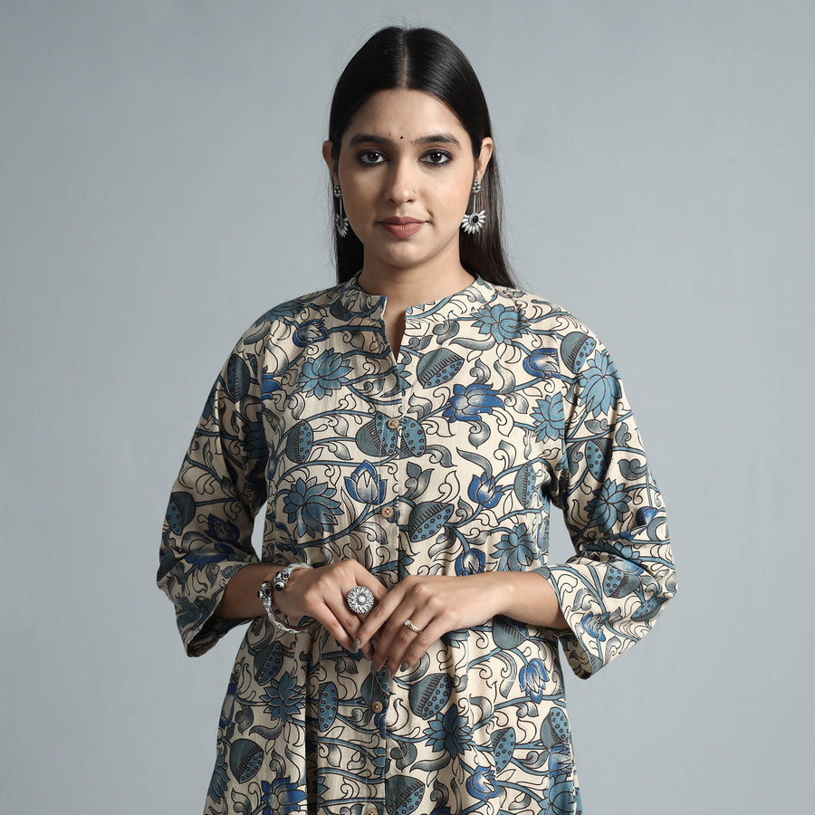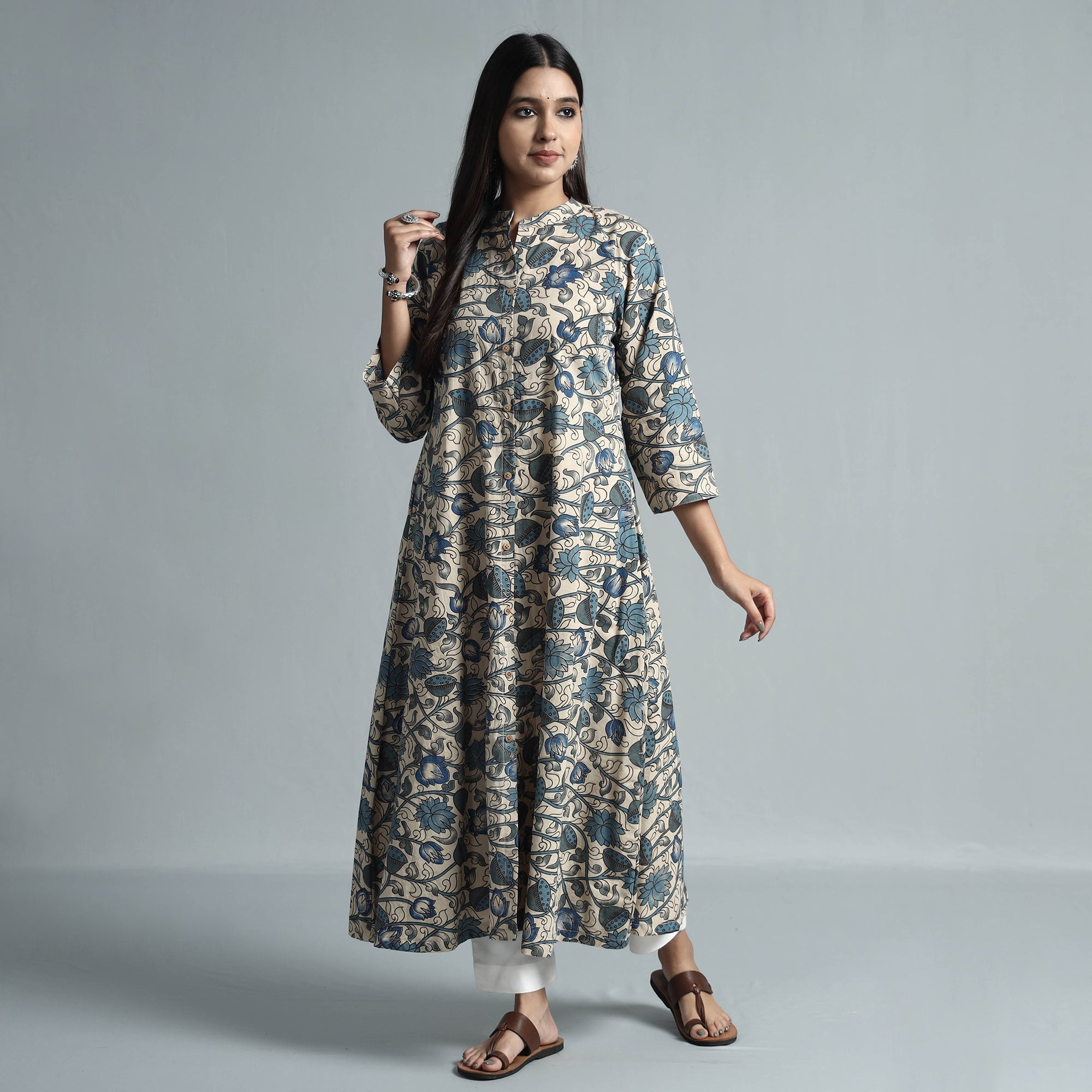 Look and feel beautiful in this uniquely designed cotton printed long kalamkari kurta with a side pocket. Kalamkari is the earliest and most complex technique of printing. This kurta is perfect for your daily outing and for a special occasion.