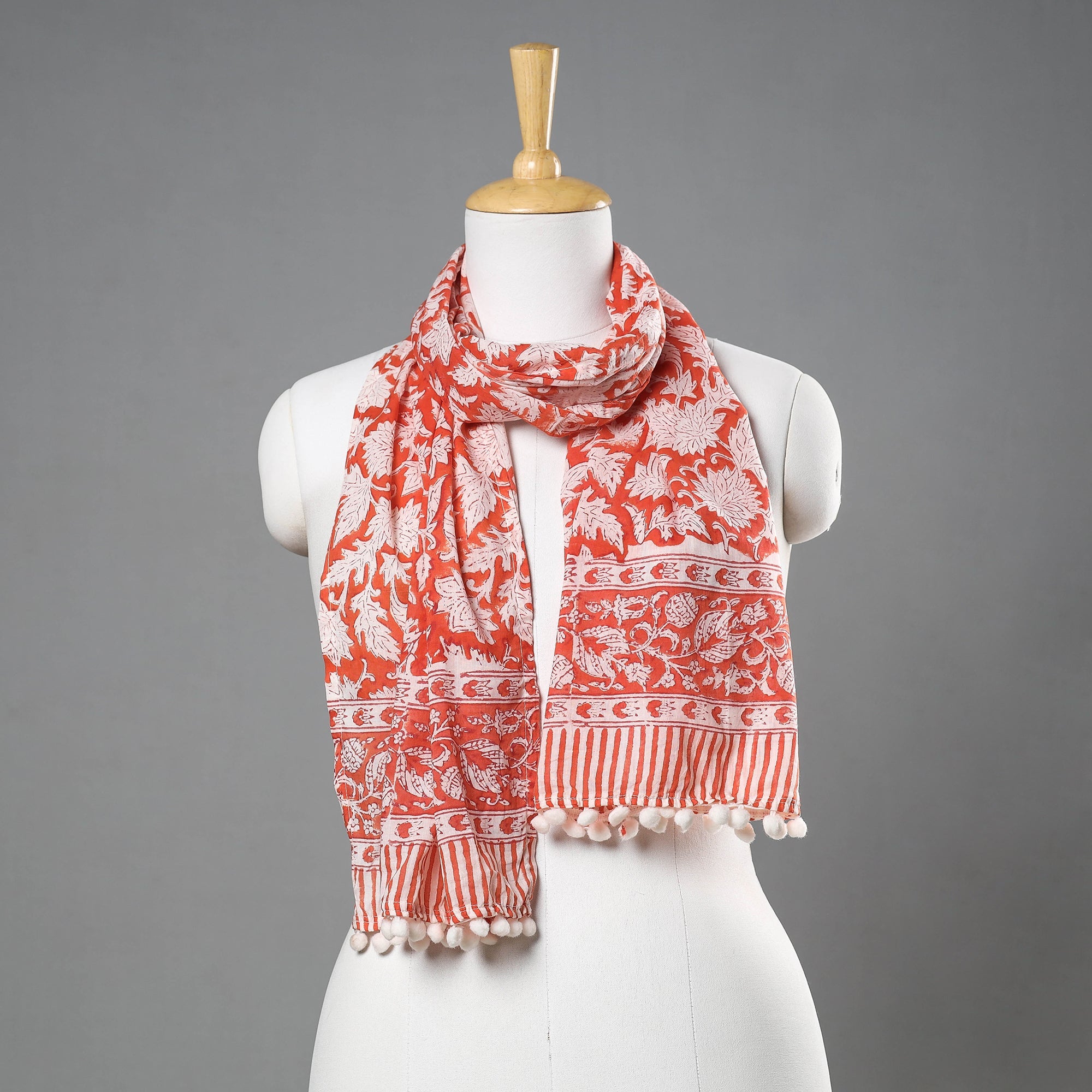 Fine quality, delicate floral sanganeri block printed cotton stole with pom pom made using VAT dyes. Sanganeri is a hand-block printing technique originating from Sanganer, a village in the southern part of Jaipur, Rajasthan. The prints of Sanganer comprise delicate floral patterns. These flower motifs are generally known as 'Buttas'.The elaborate detailing of the flowers and the petals is very exclusive to the Sanganeri prints.