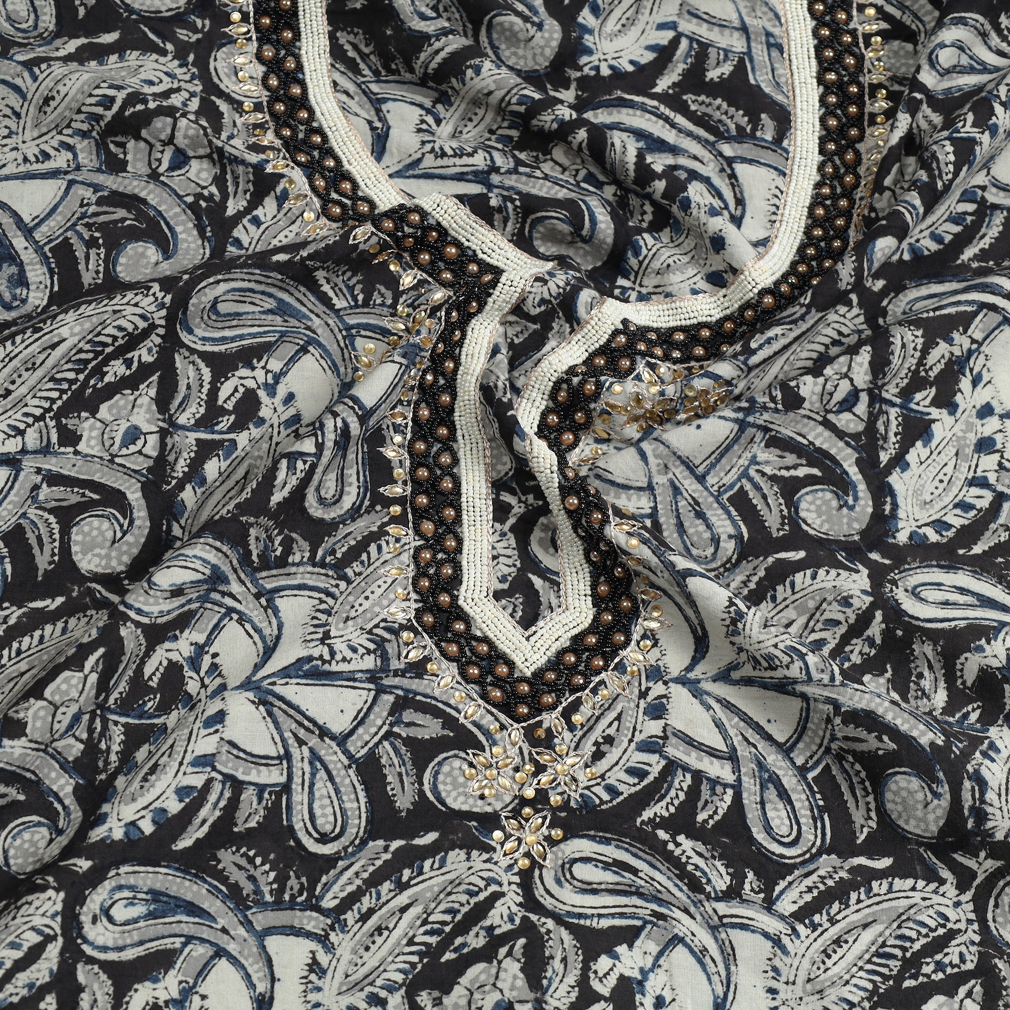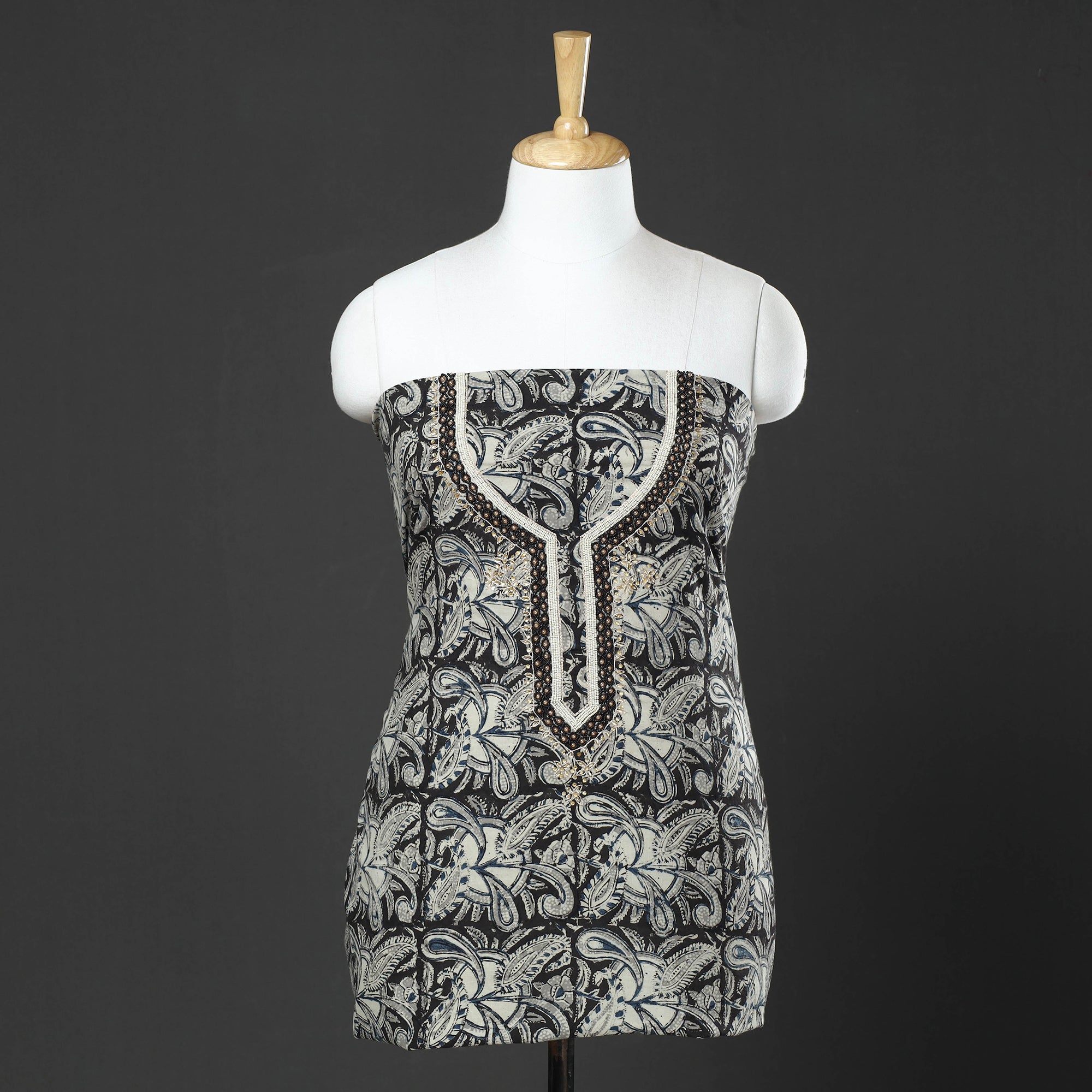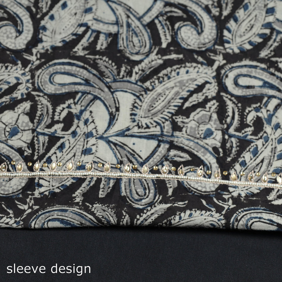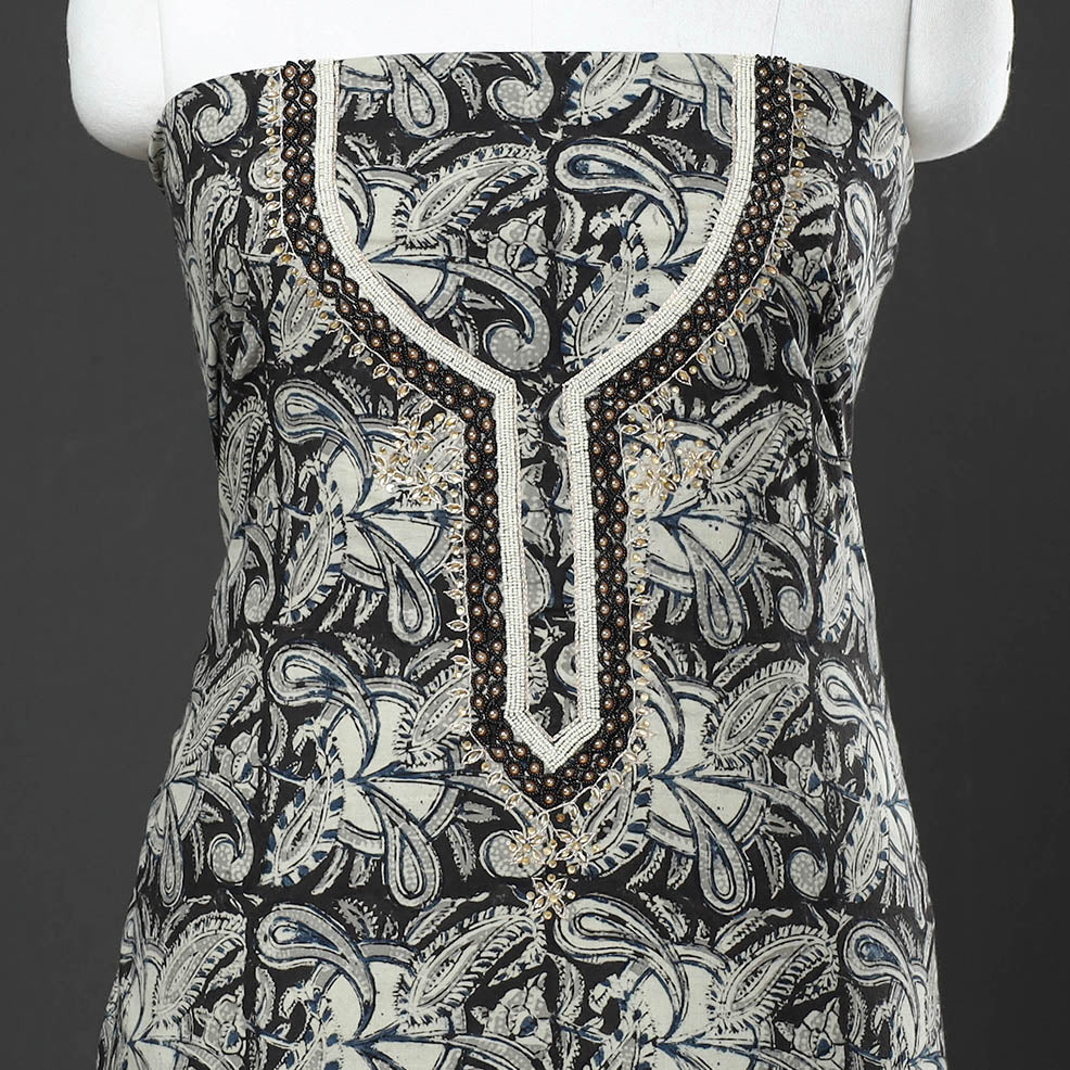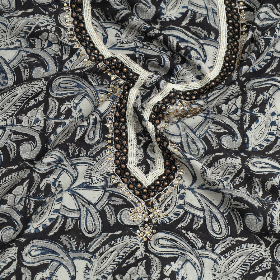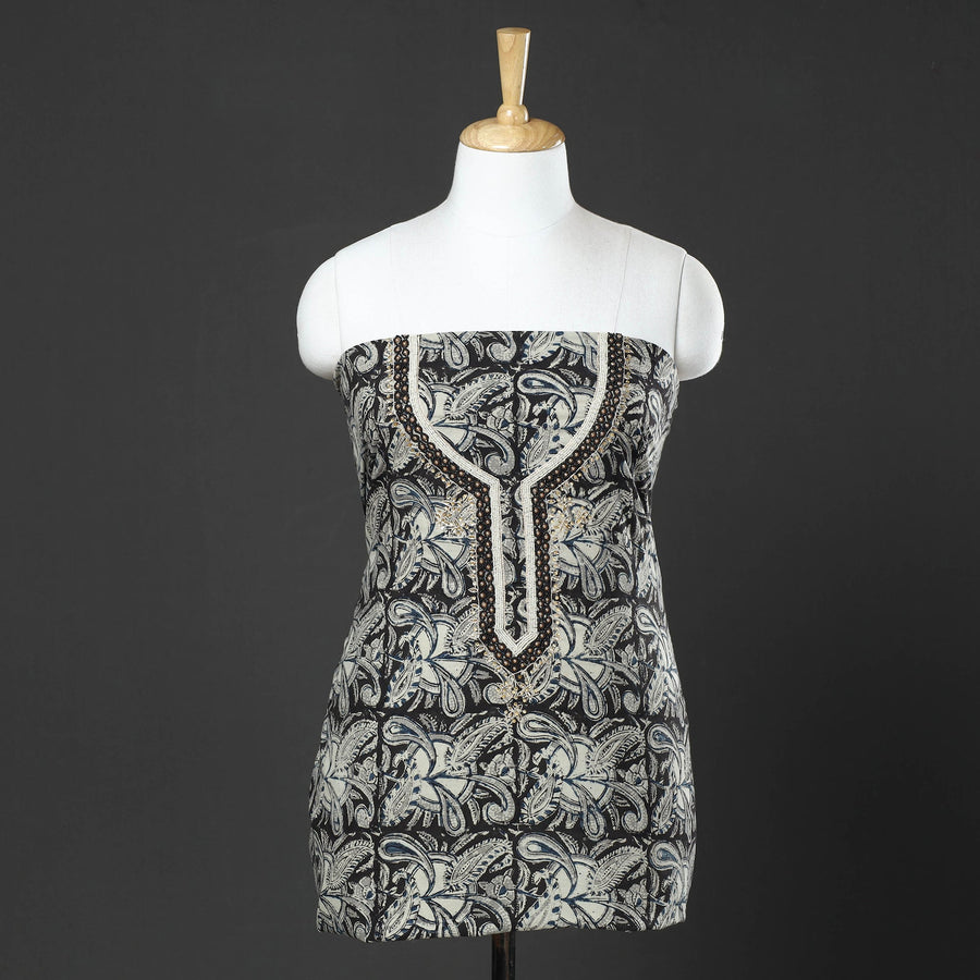 Fine quality kalamkari block printed thread and bead work hand embroidery cotton kurta material made using natural dyes through the traditional process of hand block printing practiced by the master artisans. Thread and beadwork embellishments are added with meticulous hand embroidery, ensuring each piece is a work of art. Perfect for crafting stunning kurtas, this kurta material allows you to embrace tradition and elegance.