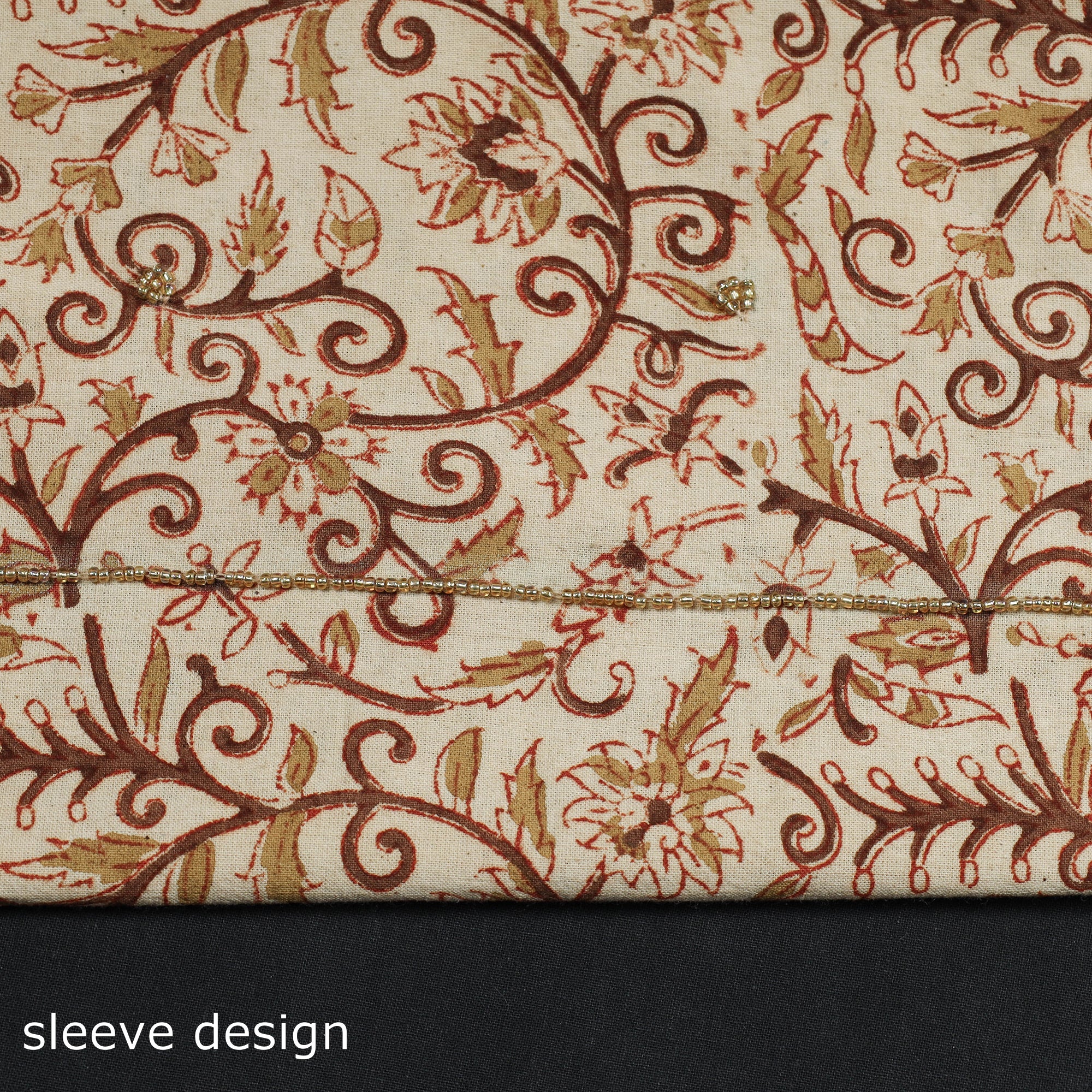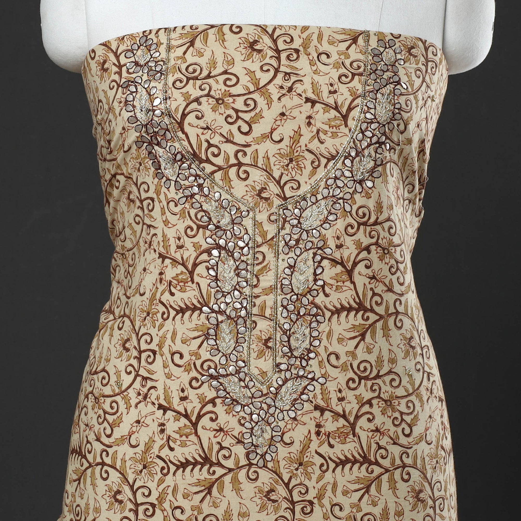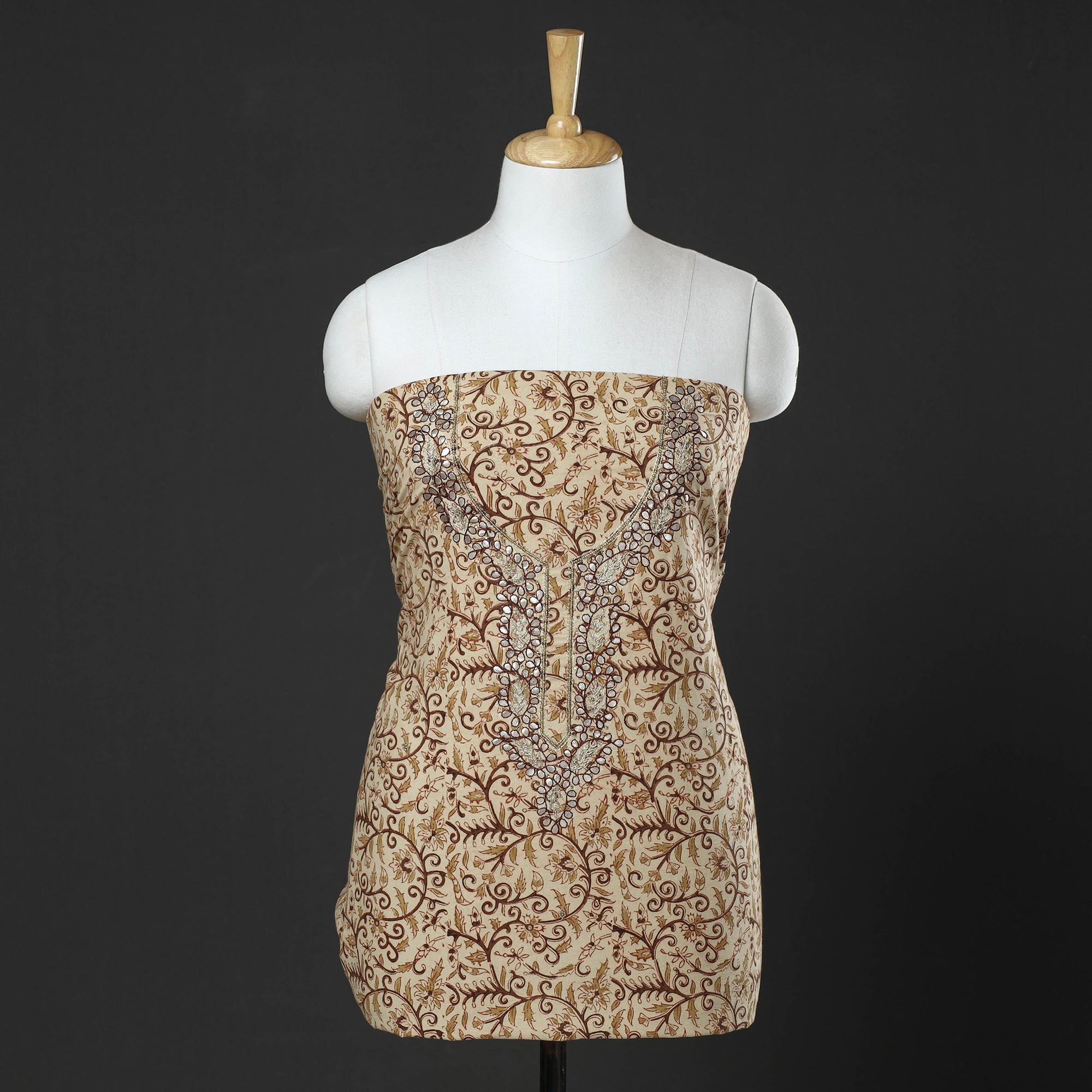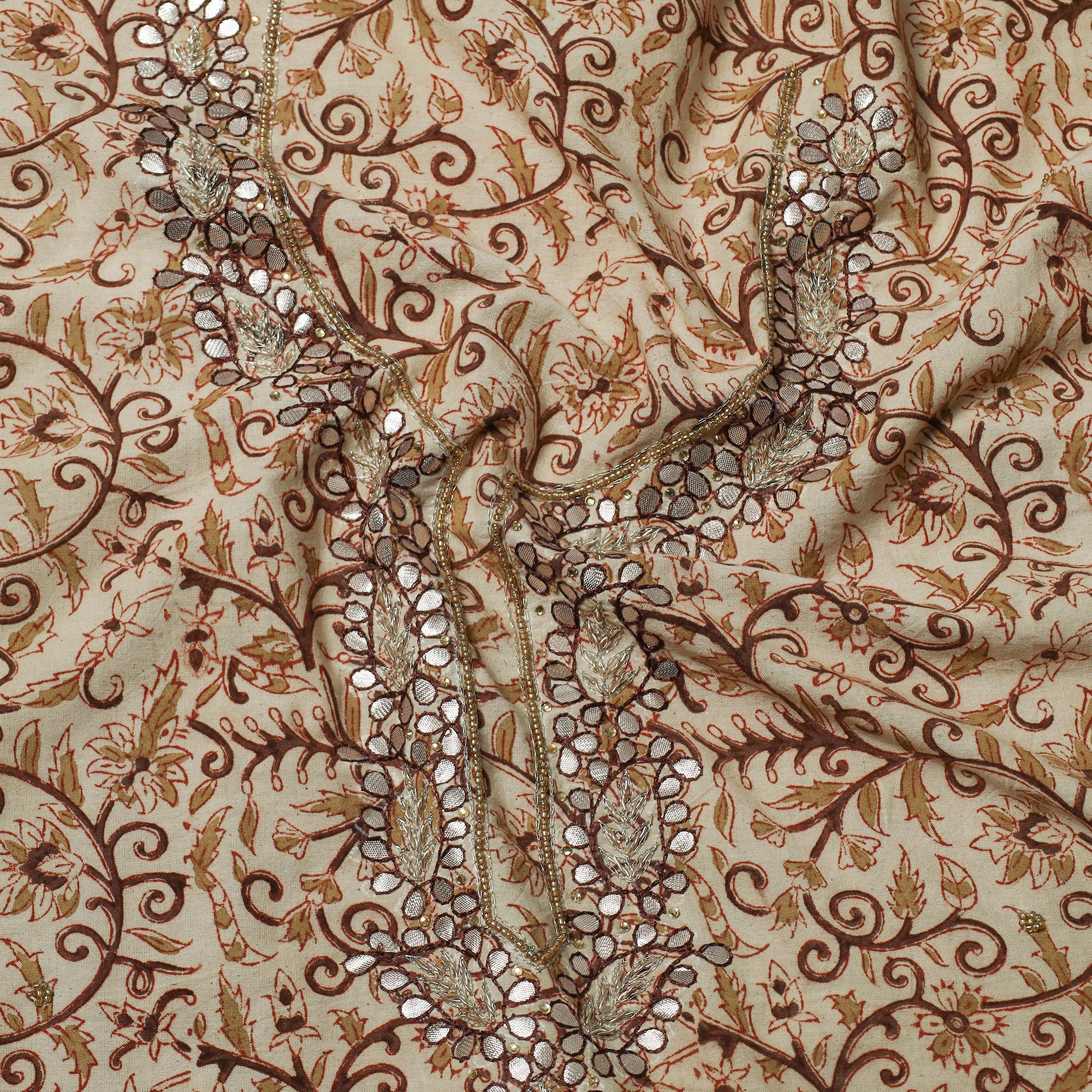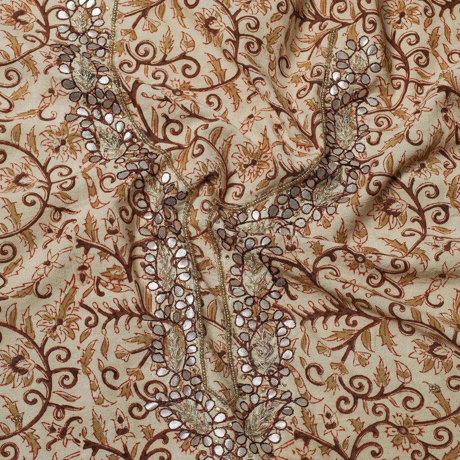 Fine quality kalamkari block printed gota patti and bead work hand embroidery cotton kurta material made using natural dyes through the traditional process of hand block printing practiced by the master artisans. Gota patti and beadwork embellishments are added with meticulous hand embroidery, ensuring each piece is a work of art. Perfect for crafting stunning kurtas, this kurta material allows you to embrace tradition and elegance.