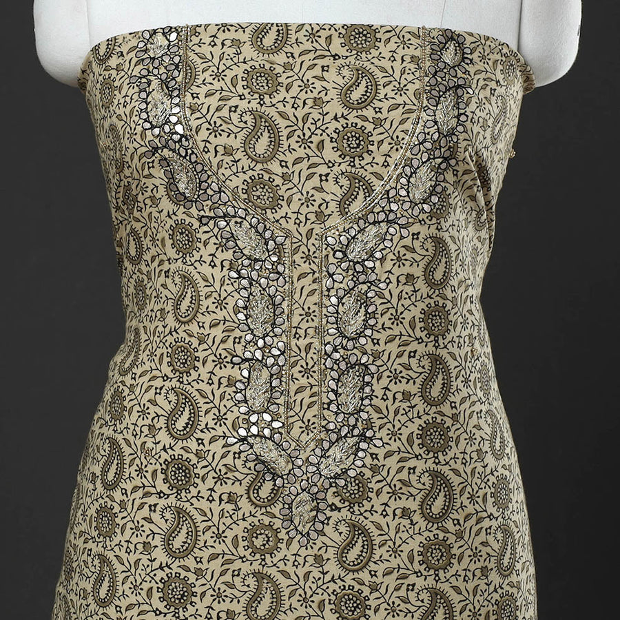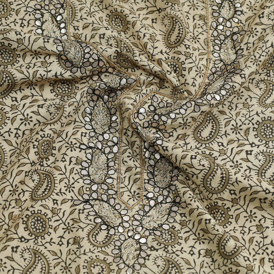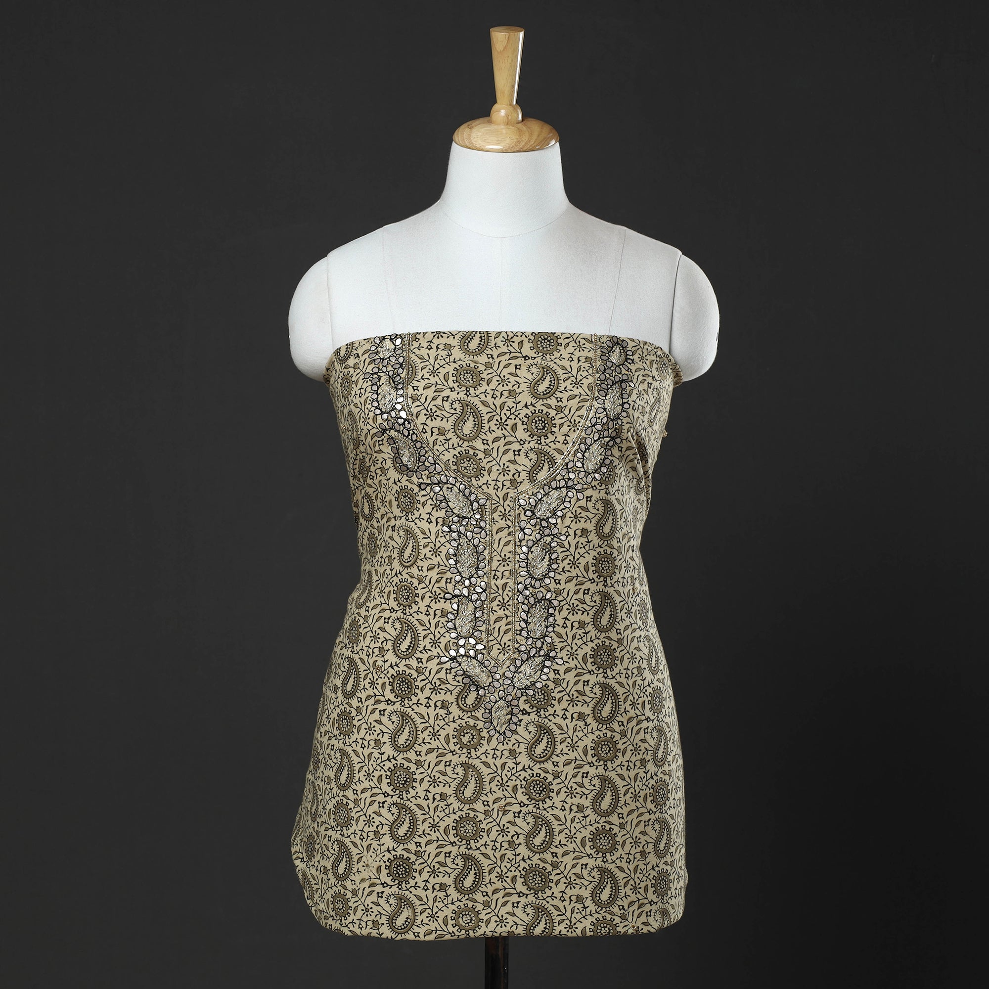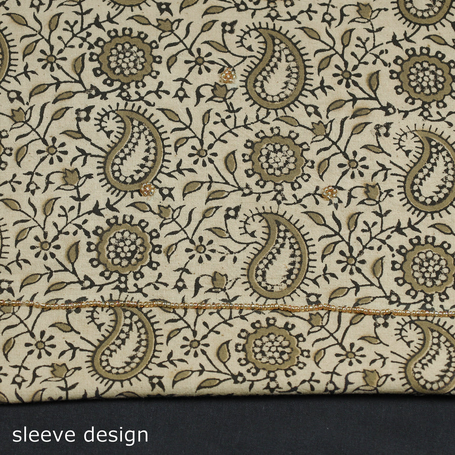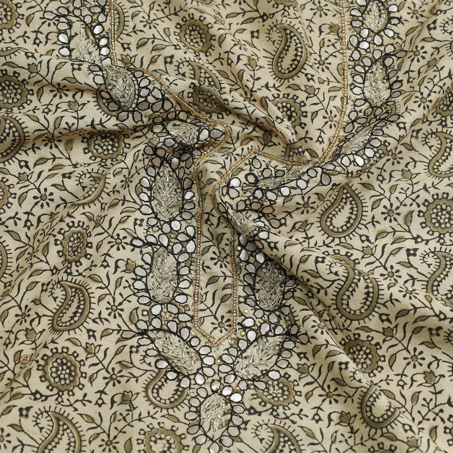 Fine quality kalamkari block printed gota patti and bead work hand embroidery cotton kurta material made using natural dyes through the traditional process of hand block printing practiced by the master artisans. Gota patti and beadwork embellishments are added with meticulous hand embroidery, ensuring each piece is a work of art. Perfect for crafting stunning kurtas, this kurta material allows you to embrace tradition and elegance.