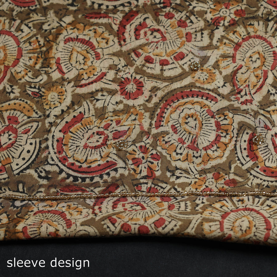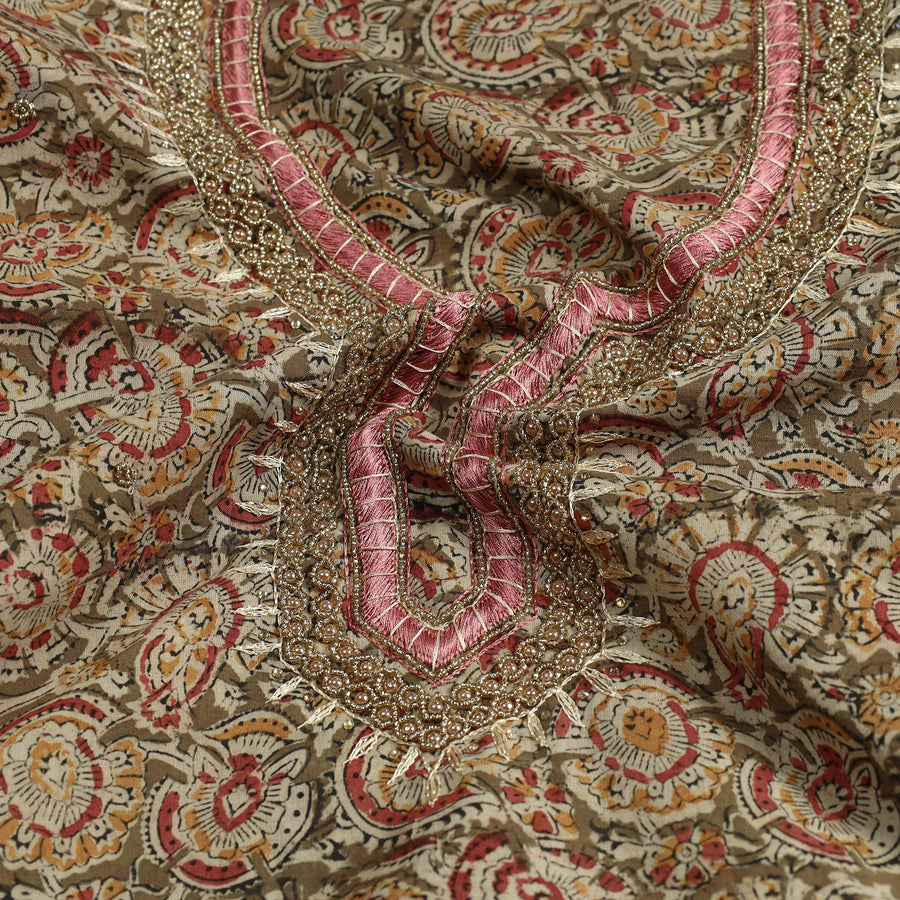 Fine quality kalamkari block printed thread and bead work hand embroidery cotton kurta material made using natural dyes through the traditional process of hand block printing practiced by the master artisans. Thread and beadwork embellishments are added with meticulous hand embroidery, ensuring each piece is a work of art. Perfect for crafting stunning kurtas, this kurta material allows you to embrace tradition and elegance.