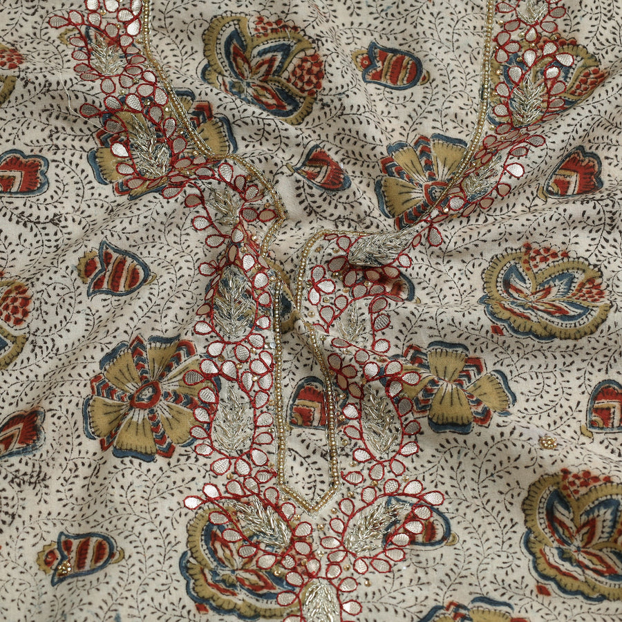 Fine quality kalamkari block printed gota patti and bead work hand embroidery cotton kurta material made using natural dyes through the traditional process of hand block printing practiced by the master artisans. Gota patti and beadwork embellishments are added with meticulous hand embroidery, ensuring each piece is a work of art. Perfect for crafting stunning kurtas, this kurta material allows you to embrace tradition and elegance.