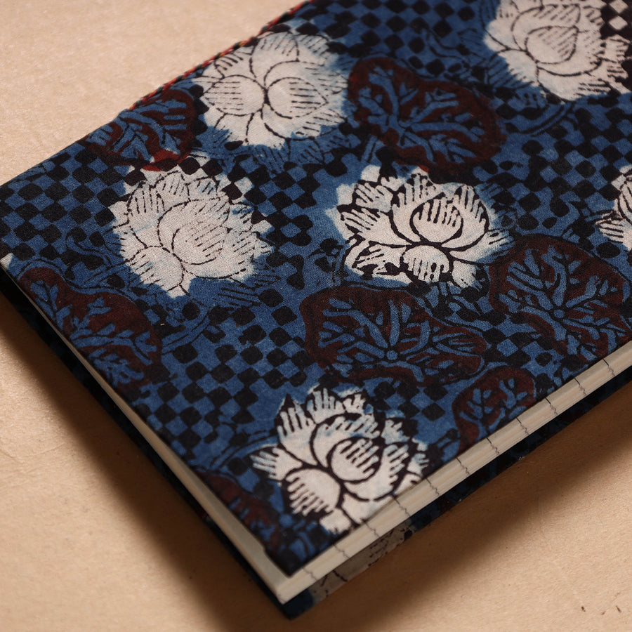 | Material | Blue bagru block printed cotton fabric embellished hard bound cover notebook with handmade papers. This paper is made of cotton, paper and other natural fibre waste recycled in an eco-friendly manner without the use of chemicals. Handmade by master artisans who maintain careful personal attention to detail. They are highly skilled in a variety of bookbinding and handmade stationery manufacturing techniques. |