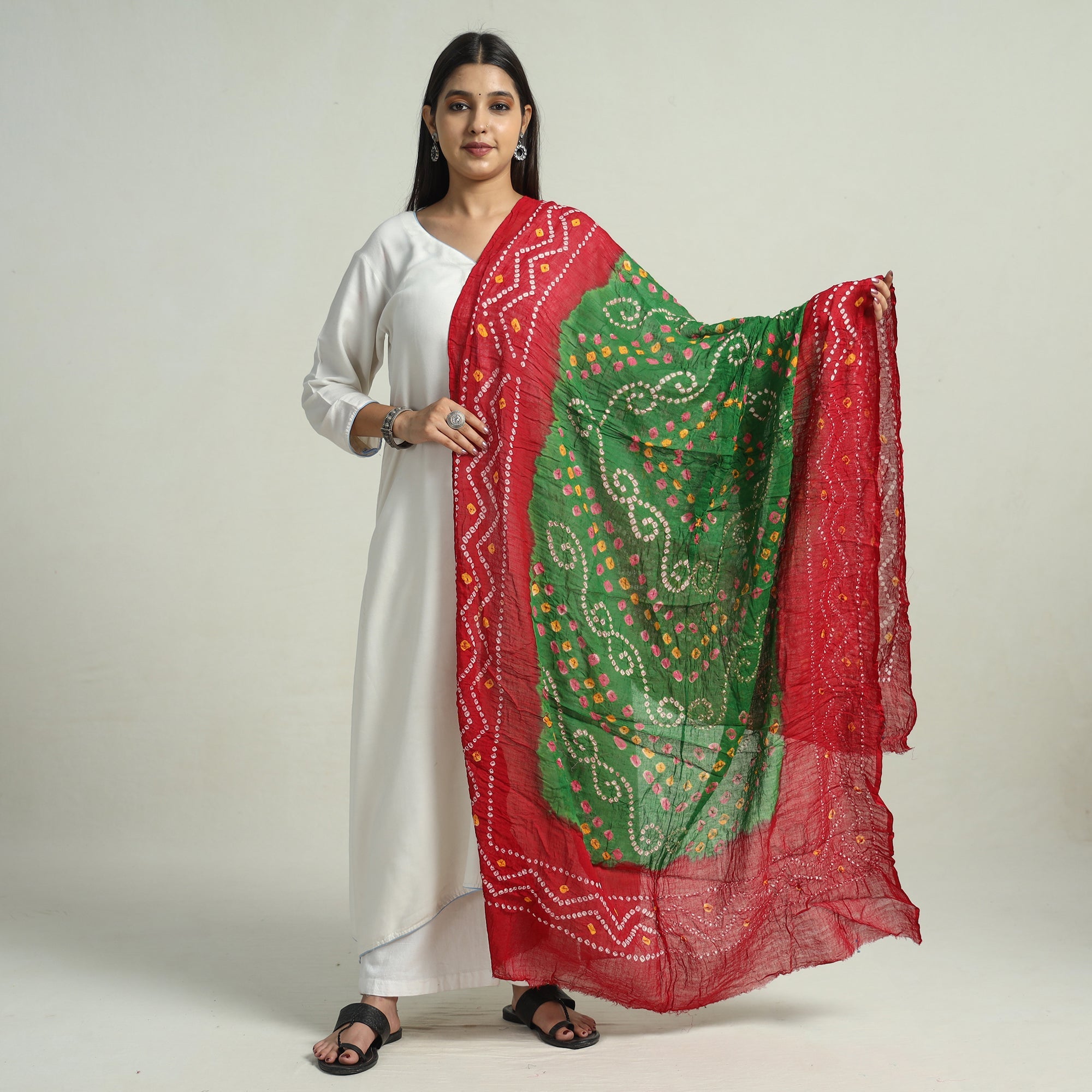 This fine-quality bandhani tie-dye mul cotton dupatta is skillfully crafted by the artisans of kutch using the traditional bandhani tie-dye technique. The dupatta features a majestic bandhani pattern, created by tying the fabric with thread at several points before dyeing it. The result is a beautiful, intricate pattern that is unique to each piece. The mul cotton fabric is lightweight and breathable, making it a perfect addition to any wardrobe for any occasion.