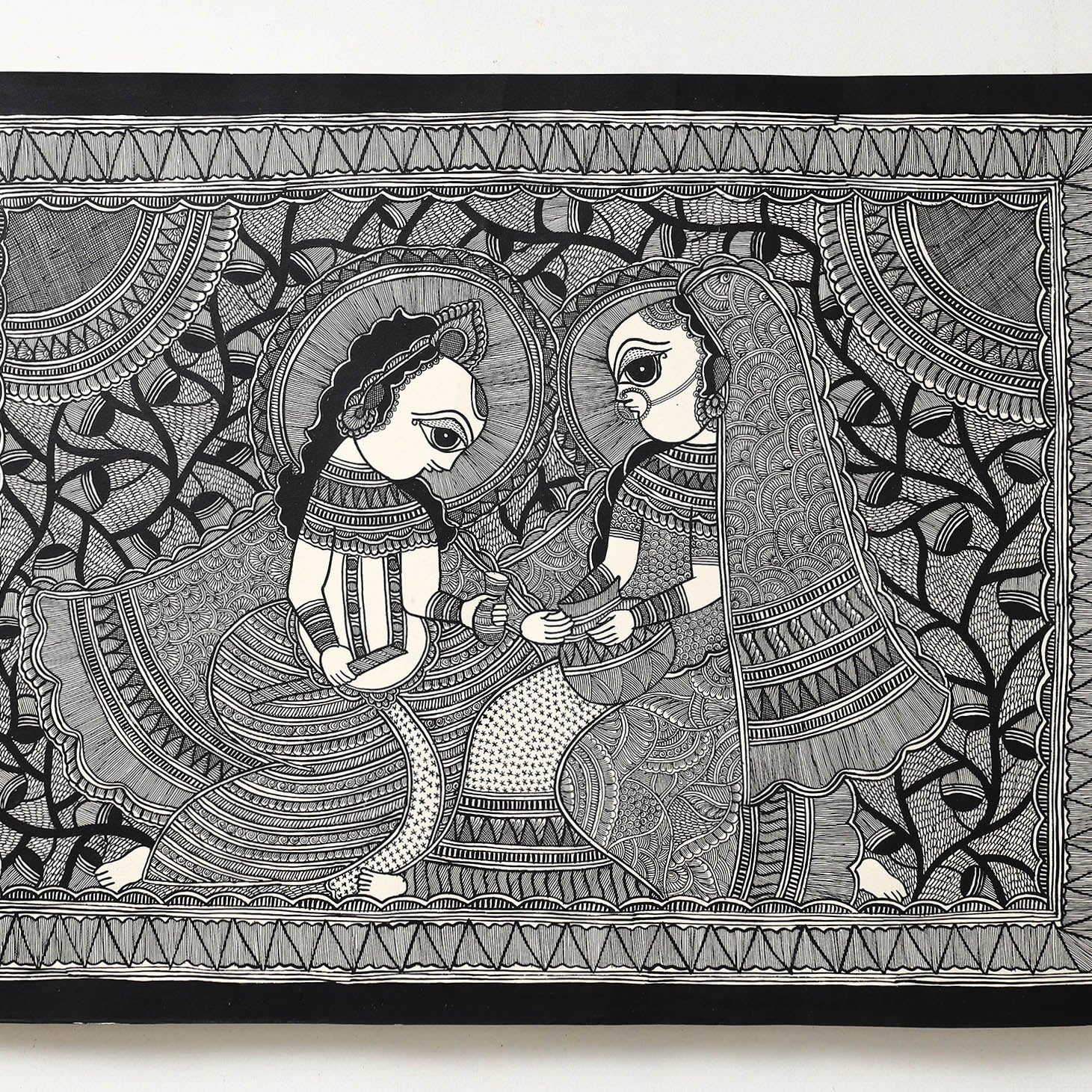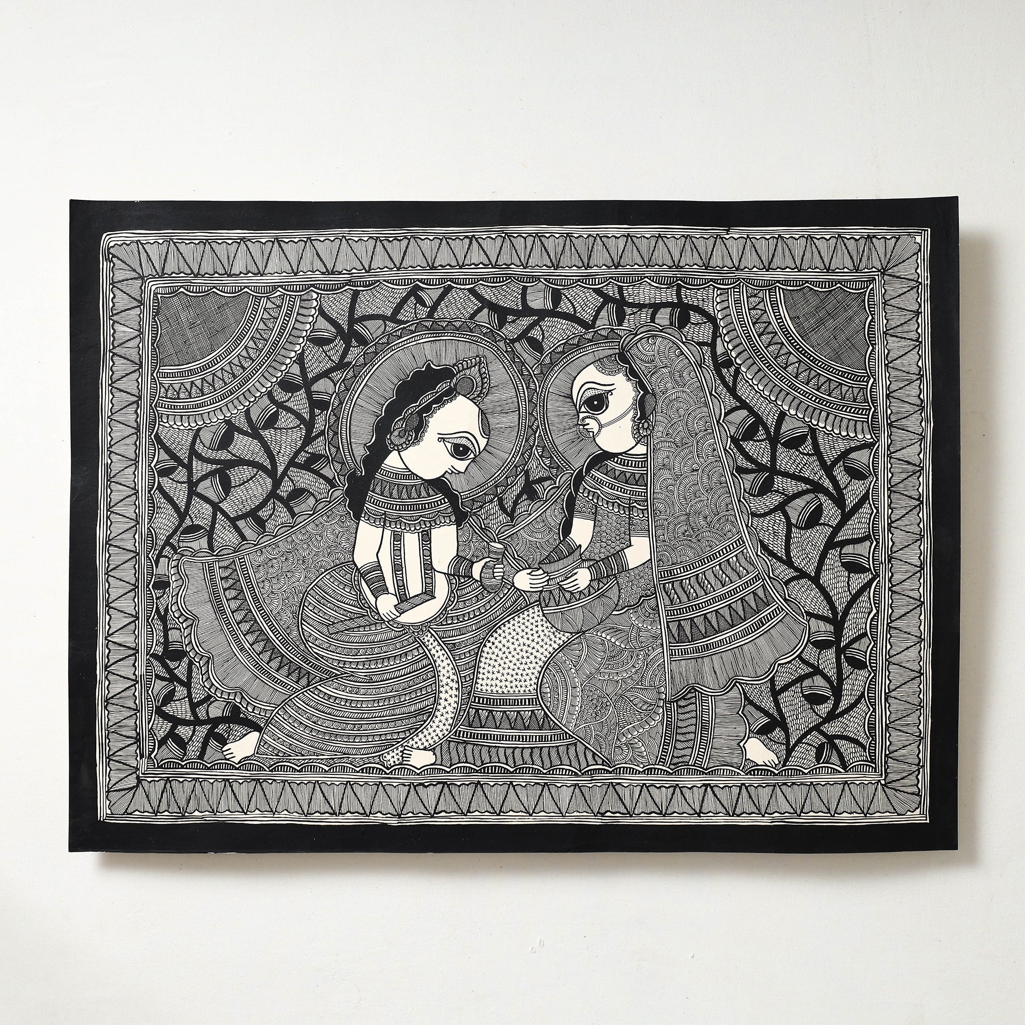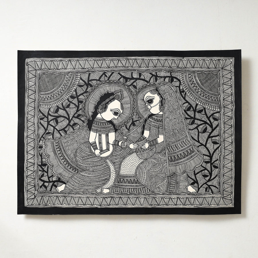 This original artwork of madhubani handpainted is done on handmade paper base, made using natural colours and permanent ink. Madhubani paintings is one of the many famous traditional Indian art forms. by master artisan Hira Devi from Bihar.