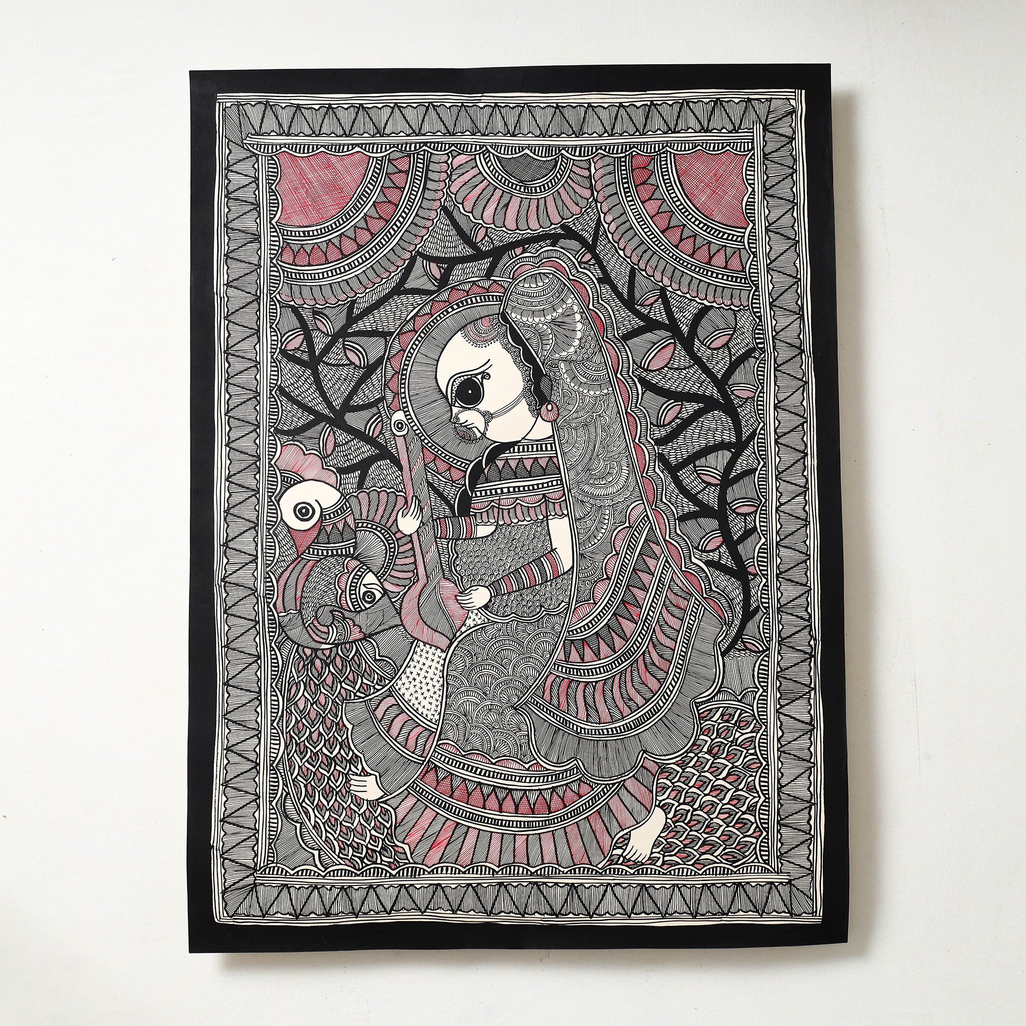This original artwork of madhubani handpainted is done on handmade paper base, made using natural colours and permanent ink. Madhubani paintings is one of the many famous traditional Indian art forms. by master artisan Hira Devi from Bihar.