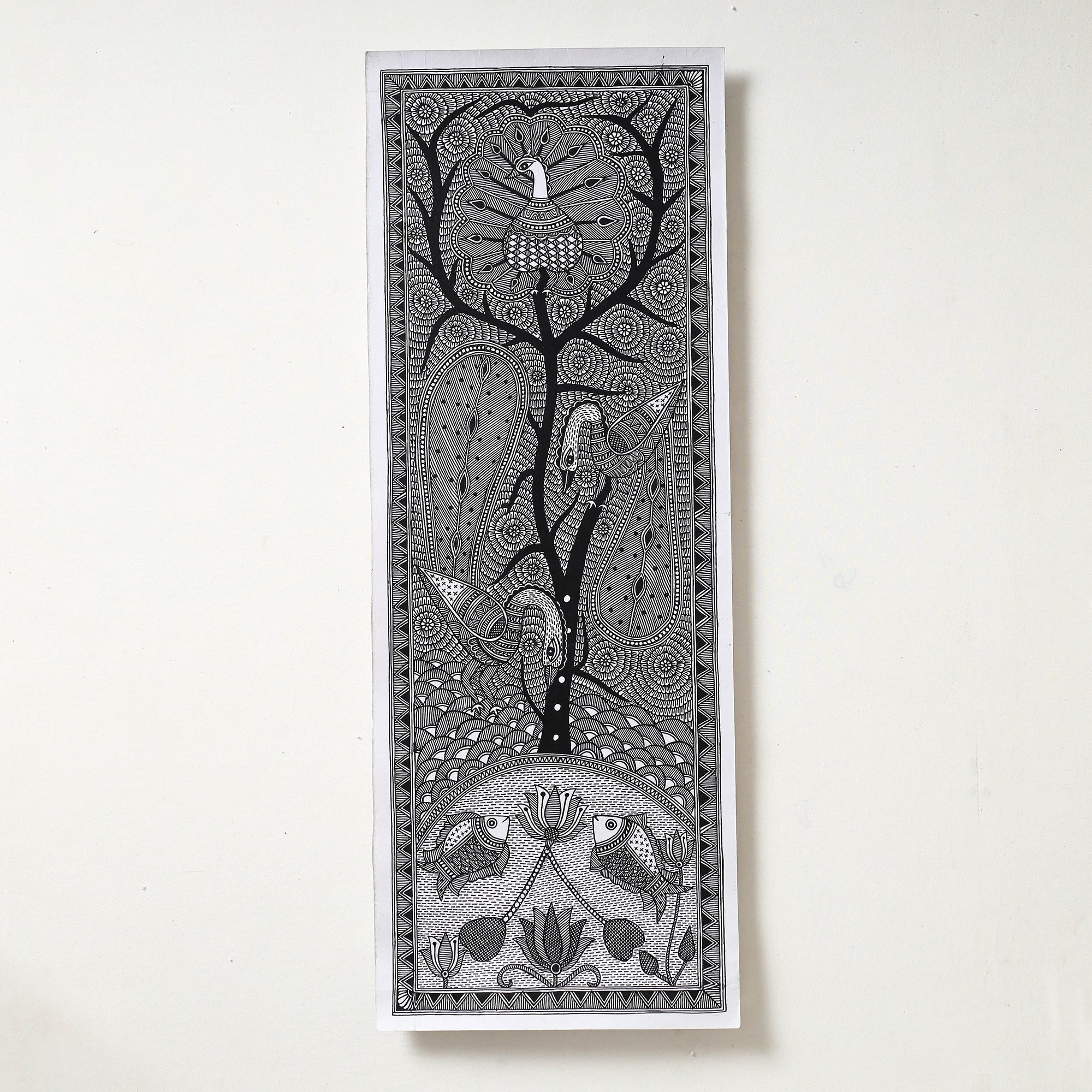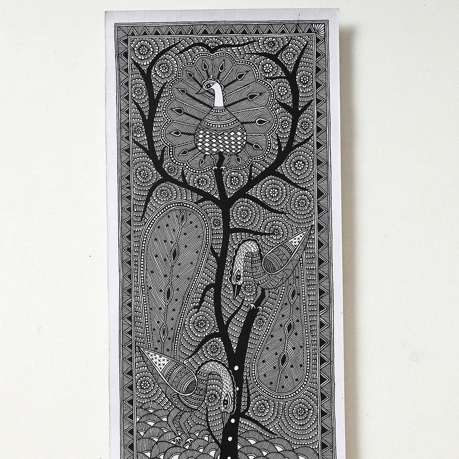 This original artwork of Madhubani handpainted is done on handmade paper base, made using natural colours and permanent ink. Madhubani paintings is one of the many famous traditional Indian art forms. by master artisan Hira Devi from Bihar.