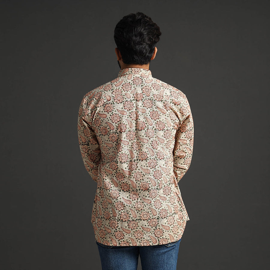 This exquisite pedana kalamkari hand block printed cotton men's full-sleeve shirt is a perfect blend of style and comfort. It's crafted from natural dyed cotton fabric, which ensures all-day comfort. This shirt features a regular collar and full sleeves, ideal for a casual yet sophisticated look. The crisp wooden buttons add a touch of natural charm, while the patch pocket on the front offers convenience and practicality. This shirt keeps you comfortable and stylish all day. It is perfect for casual wear.