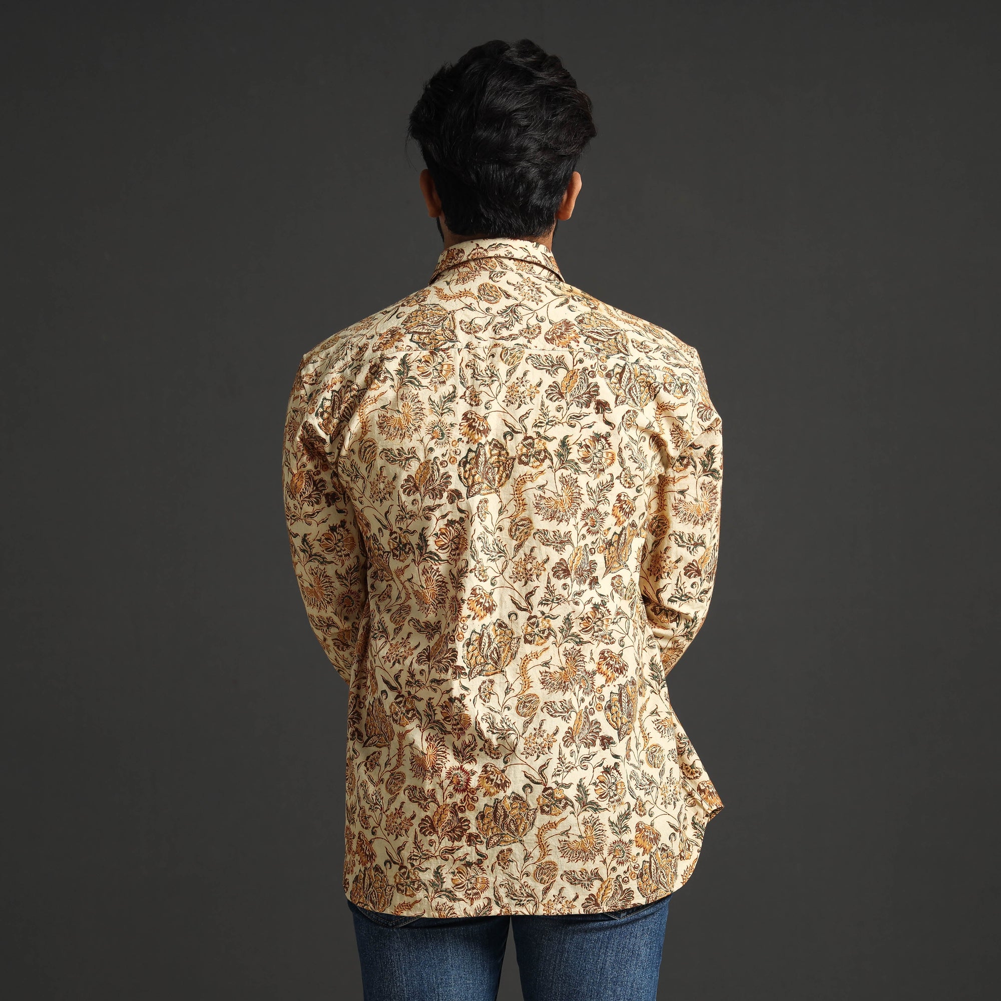 This exquisite pedana kalamkari hand block printed cotton men's full-sleeve shirt is a perfect blend of style and comfort. It's crafted from natural dyed cotton fabric, which ensures all-day comfort. This shirt features a regular collar and full sleeves, ideal for a casual yet sophisticated look. The crisp wooden buttons add a touch of natural charm, while the patch pocket on the front offers convenience and practicality. This shirt keeps you comfortable and stylish all day. It is perfect for casual wear.