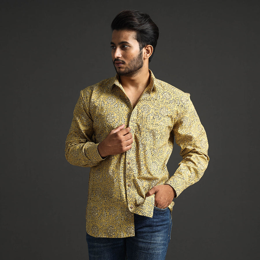 This exquisite pedana kalamkari hand block printed cotton men's full-sleeve shirt is a perfect blend of style and comfort. It's crafted from natural dyed cotton fabric, which ensures all-day comfort. This shirt features a regular collar and full sleeves, ideal for a casual yet sophisticated look. The crisp wooden buttons add a touch of natural charm, while the patch pocket on the front offers convenience and practicality. This shirt keeps you comfortable and stylish all day. It is perfect for casual wear.