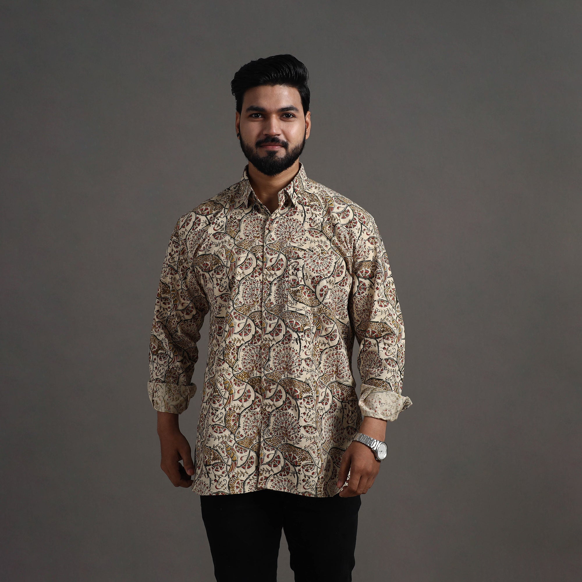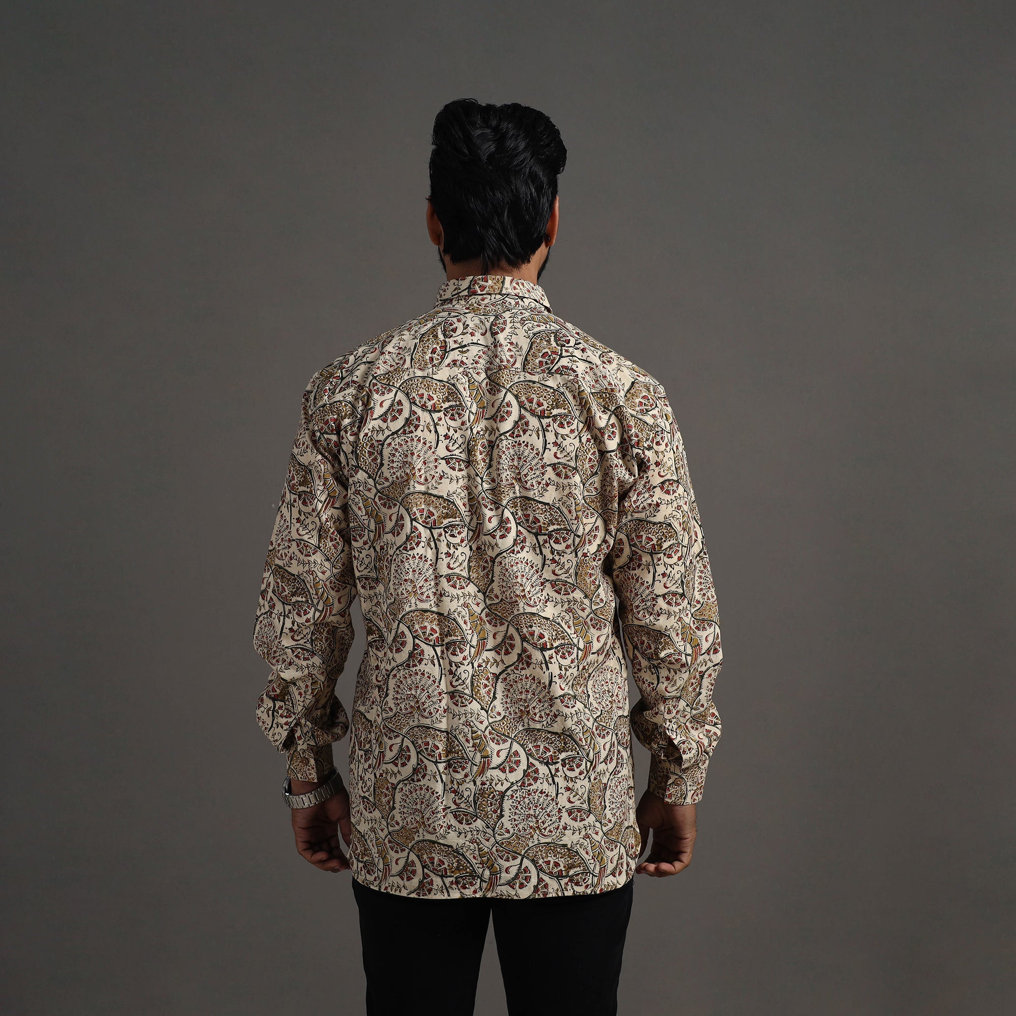 This exquisite pedana beige kalamkari hand block printed cotton men's full-sleeve shirt is a perfect blend of style and comfort. It's crafted from natural dyed cotton fabric, which ensures all-day comfort. This shirt features a regular collar and full sleeves, ideal for a casual yet sophisticated look. The crisp wooden buttons add a touch of natural charm, while the patch pocket on the front offers convenience and practicality. This shirt keeps you comfortable and stylish all day. It is perfect for casual wear.