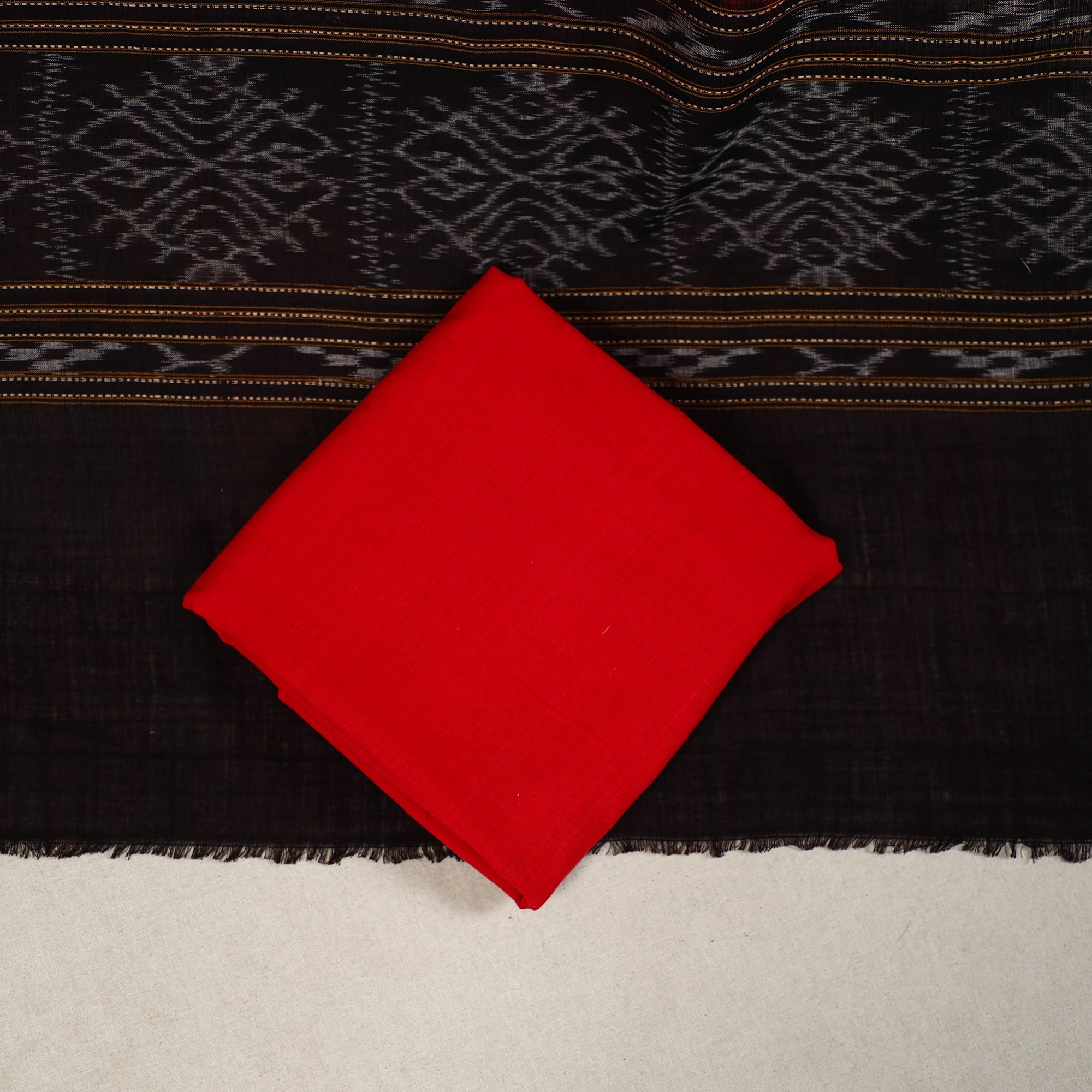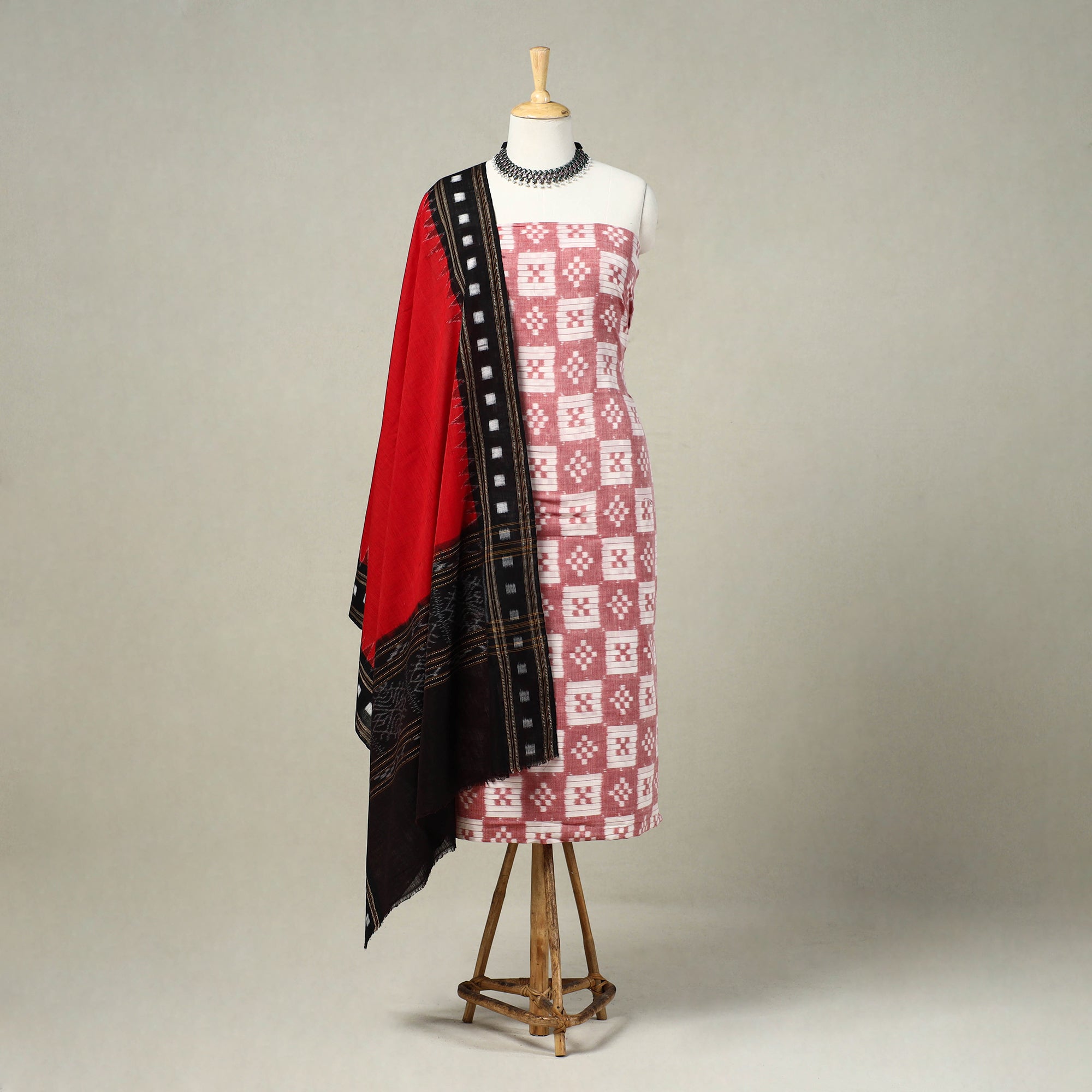 Indulge in the rich heritage of odisha with our exquisite red sambalpuri ikat weaving handloom cotton kurti material set. This set includes a dupatta and plain matching bottom, featuring traditional motifs like shankha (shell), chakra (wheel), and phula (flower) meticulously crafted by master artisans from the eastern states. Made from fine quality cotton, this kurti material set is a perfect blend of comfort and style, showcasing the beauty of ikat weaving.