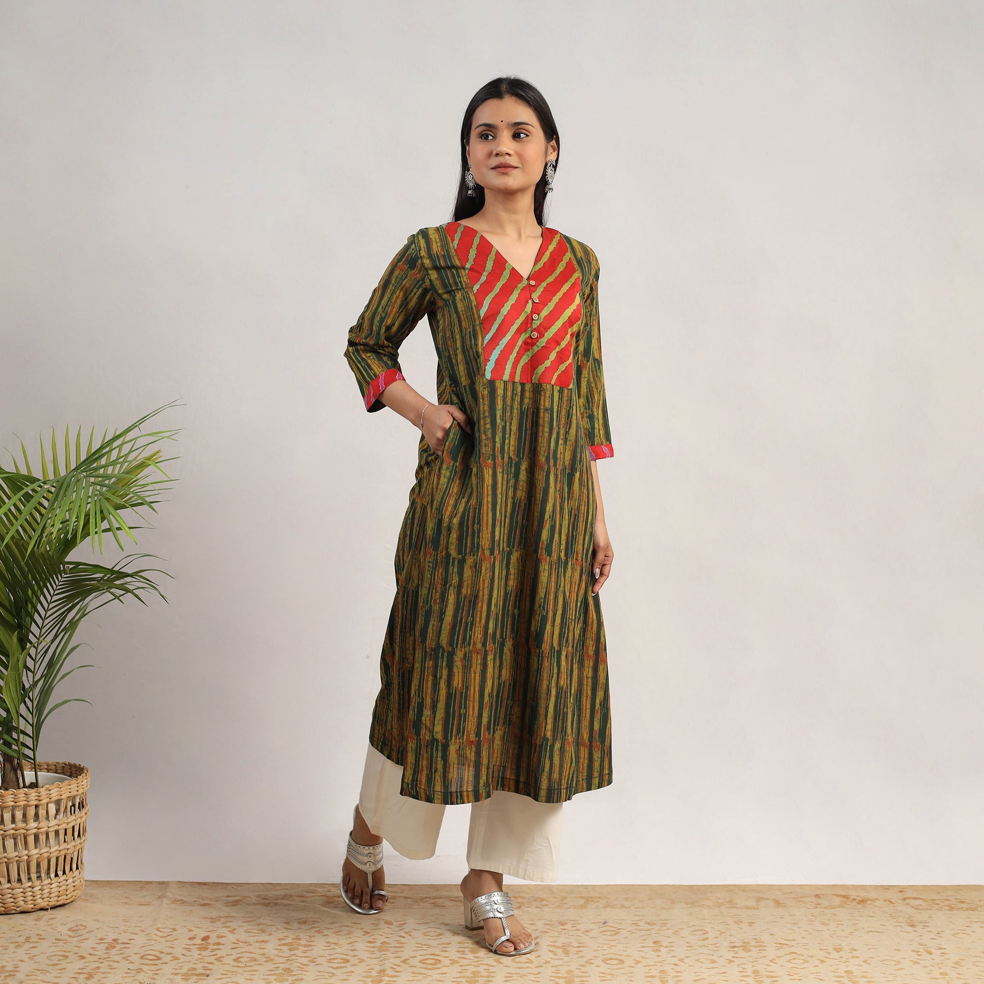 This uniquely designed hand block print cotton a-line green akola kurta with patchwork is made using naturally dyed cotton fabric through the traditional mud resist process of hand block printing practised by the master artisans in Akola village of Rajasthan. The kurta also features a convenient one-side pocket, perfect for carrying small essentials. This cotton kurta makes you comfortable all day long.