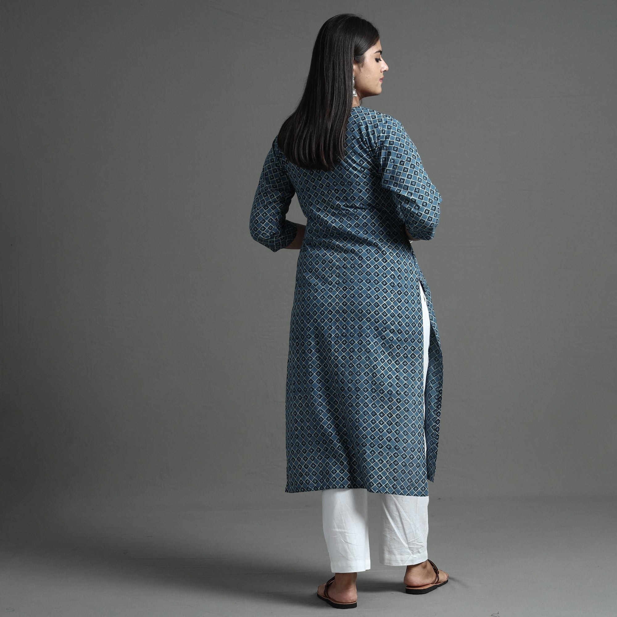 This uniquely designed akola hand block printed cotton pintuck long kurta is made using naturally dyed cotton fabric through the traditional mud resist process of hand block printing practised by the master artisans in Akola village of Rajasthan. The kurta also features a convenient one-side pocket, perfect for carrying small essentials. This cotton kurta makes you comfortable all day long. This kurta is perfect for your daily outing and for a special occasion.