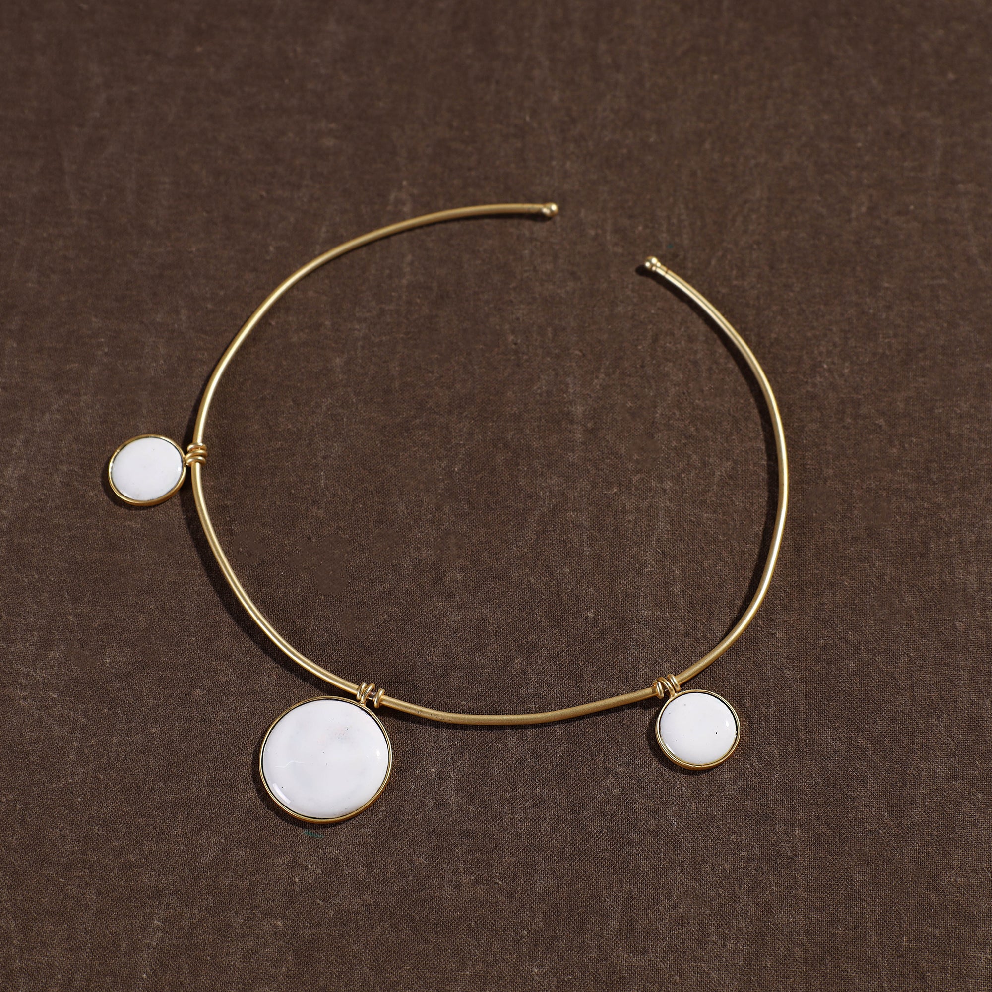 Elevate your style with our exquisite white handcrafted brass hasli necklace featuring a stunning meenakari pendant. This unique piece combines traditional craftsmanship with contemporary design. The intricate Meenakari work adds vibrant colors and intricate detailing, making it a perfect accessory for any special occasion or to enhance your everyday elegance. Meenakari is the art of coloring and ornamenting the surface of metals by fusing over it brilliant colors that are decorated in an intricate design.