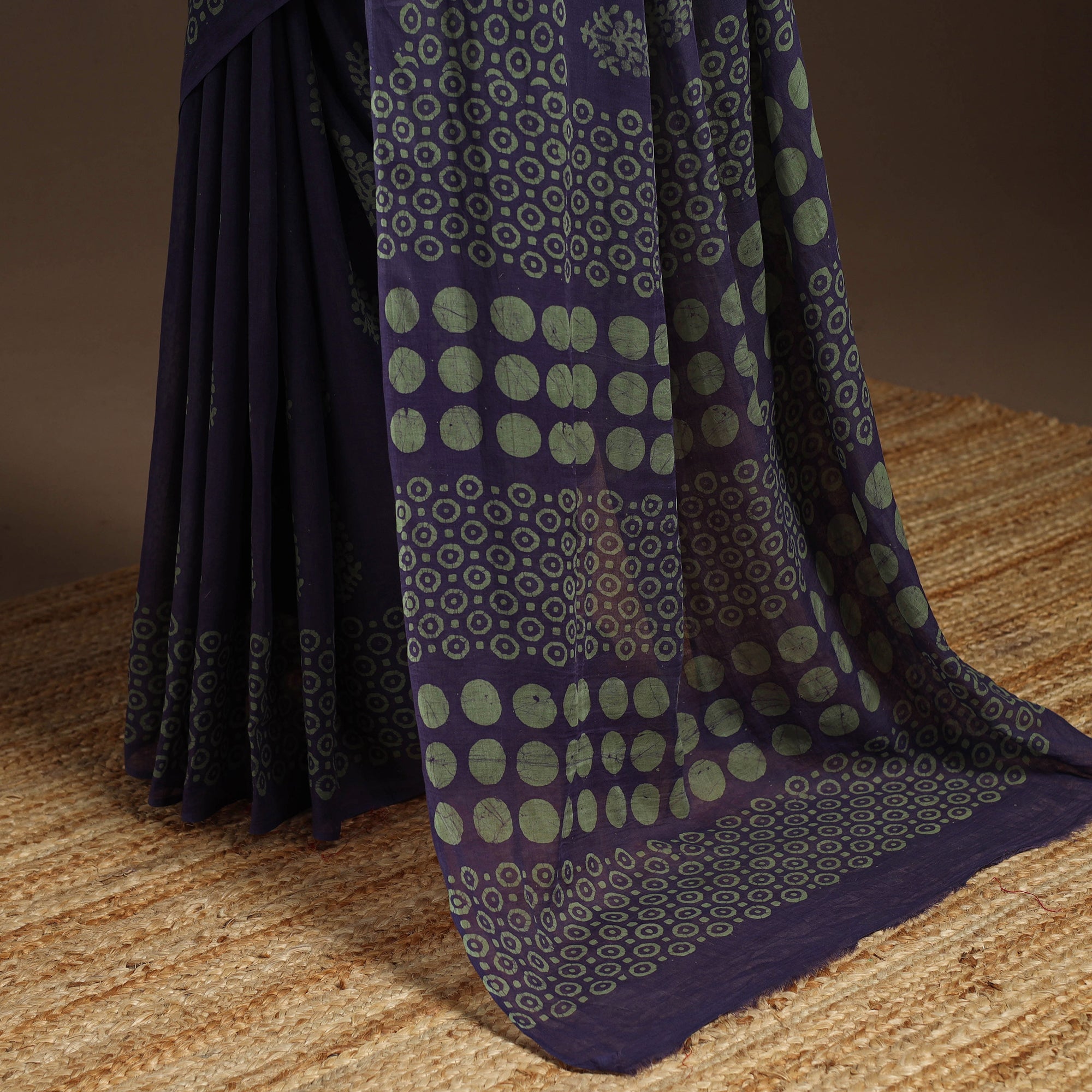 Fine quality purple hand batik printed mul cotton saree. Batik is a technique of wax-resist dyeing applied to whole cloth, or cloth made using this technique. The traditional designs and motifs in Indian batik are often passed down from one generation to another.