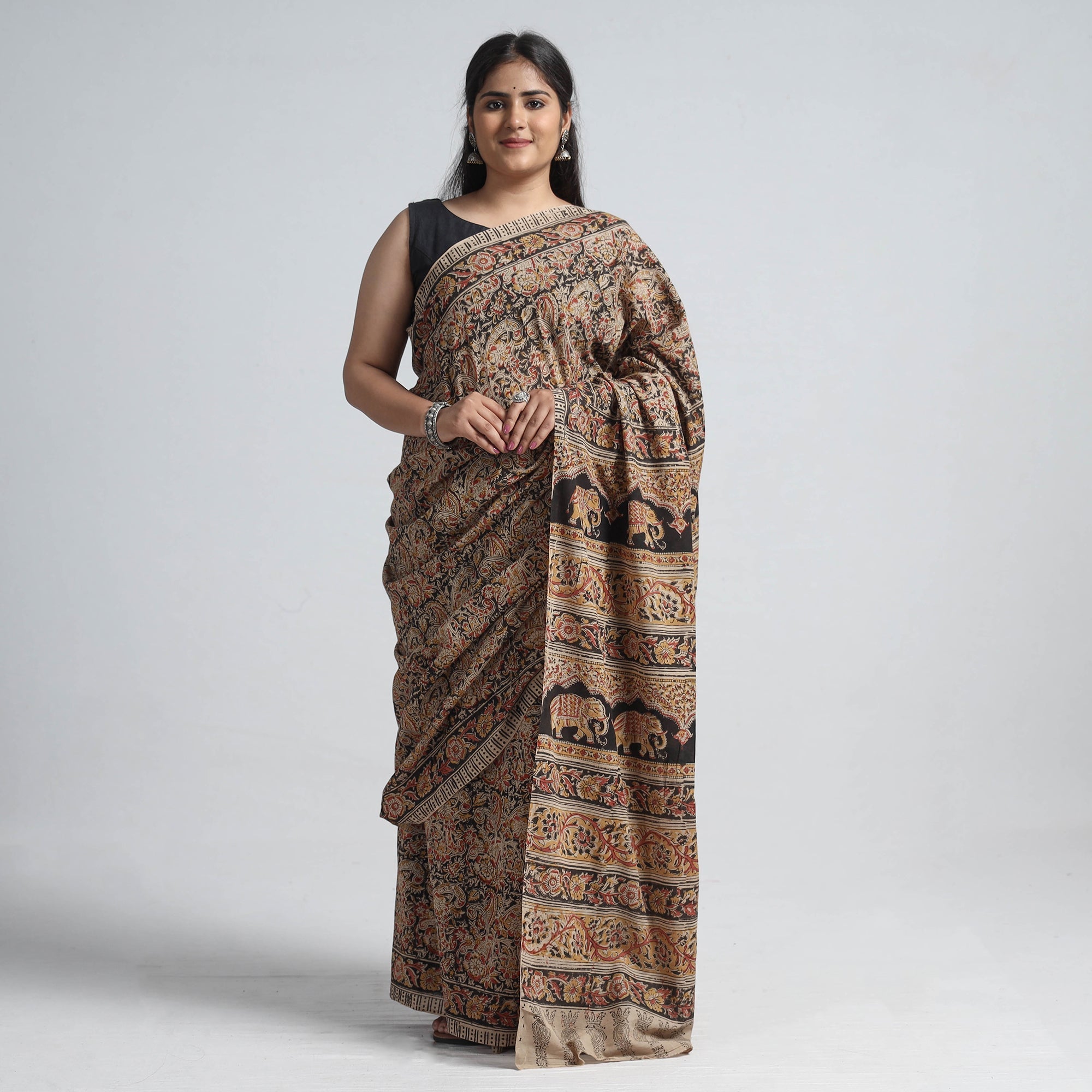 Fine-quality brown Kalamkari saree with block-printed. This kalamkari cotton saree features intricate designs and natural dyes, reflecting the rich tradition of Kalamkari art. Perfect for special occasions, it combines elegance with comfort. Celebrate Indian craftsmanship and support local artisans with this unique piece.