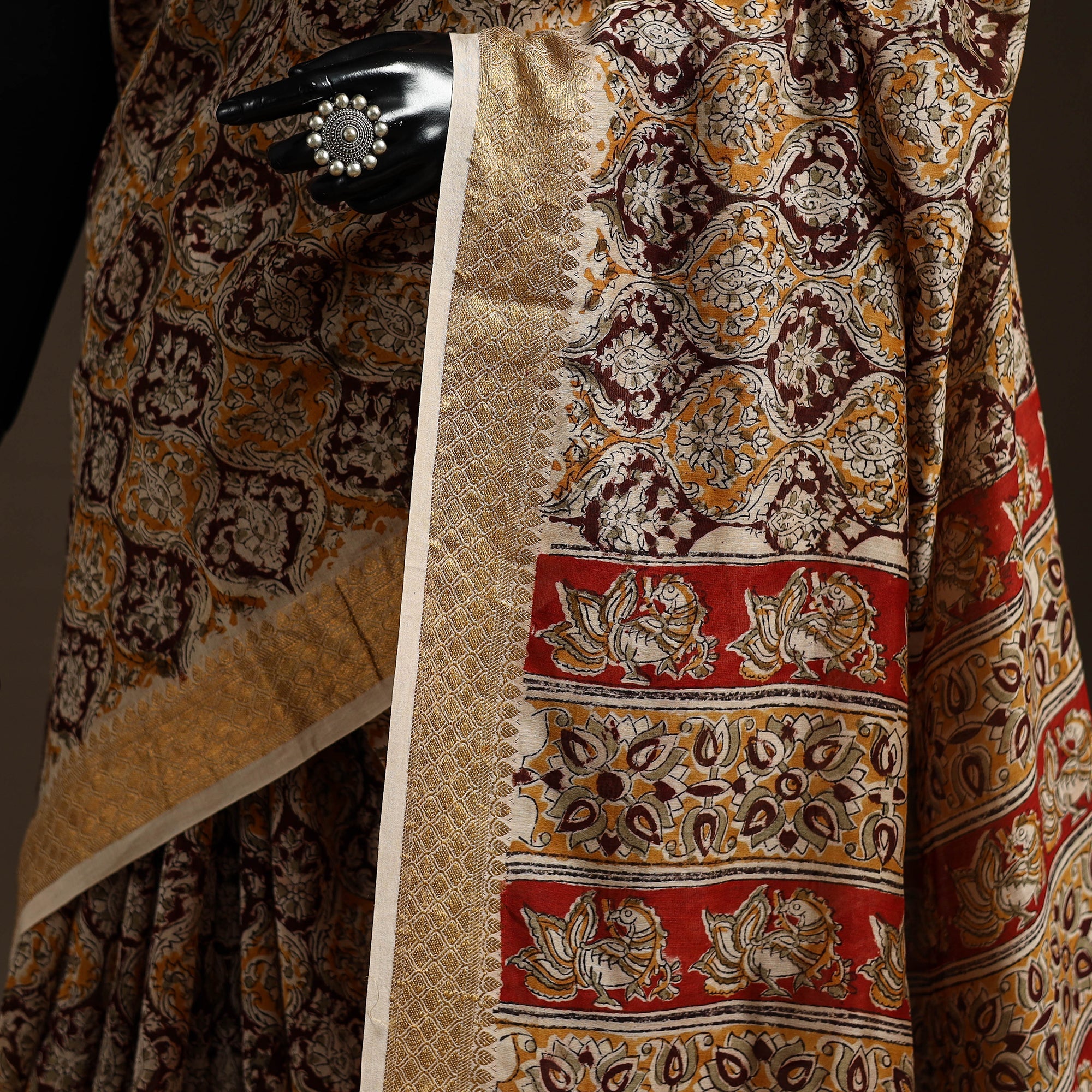 Kalamkari is a type of hand-painted or printed cotton fabric produced in Andhra Pradesh. This is a traditional printing method on cotton fabrics using natural materials without adding chemicals to cotton fabrics.