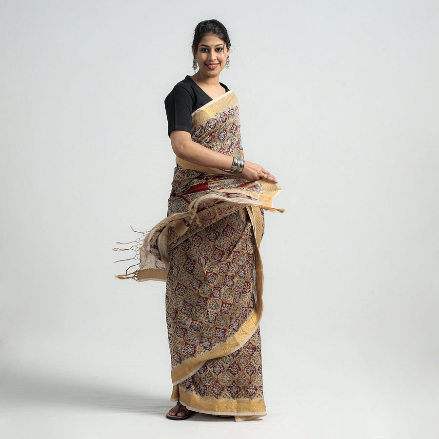 Experience the elegance of our original brown pedana kalamkari saree. Hand block printed with intricate designs and a stunning zari border, this saree blends tradition with luxury. Crafted from Chanderi silk, it features the timeless art of Kalamkari, perfect for any special occasion.